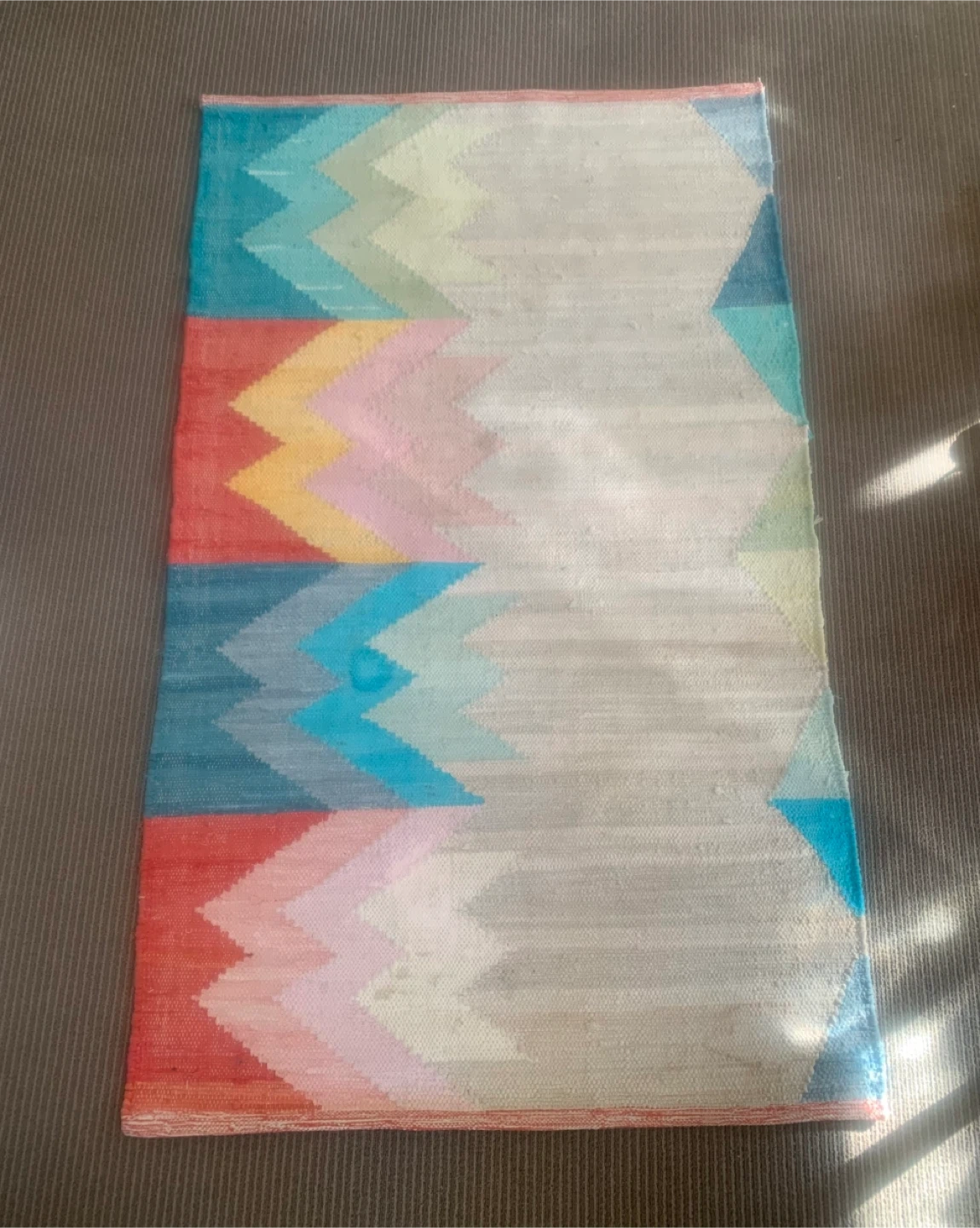Selling a colourful area rug from West Elm! It measures approximately 36 inches by 60 inches. It has a unique zigzag pattern with various colours, perfect for adding a vibrant touch to any room. Pick up at Eglinton Ave east at Bayview.