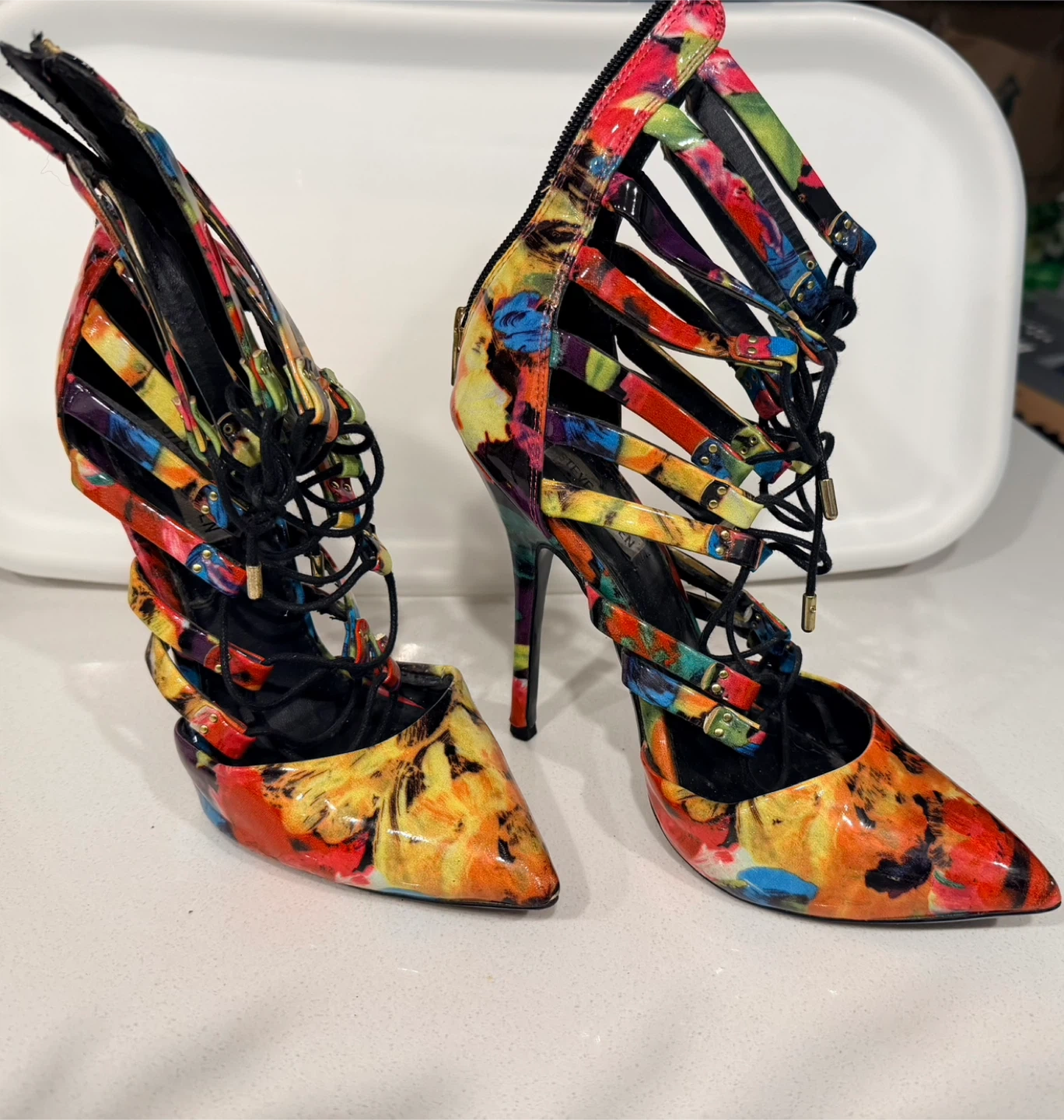 These heels have a vibrant and colourful pattern. They feature a unique cut-out design with a zipper at the back. Perfect for adding a pop of colour to any outfit!