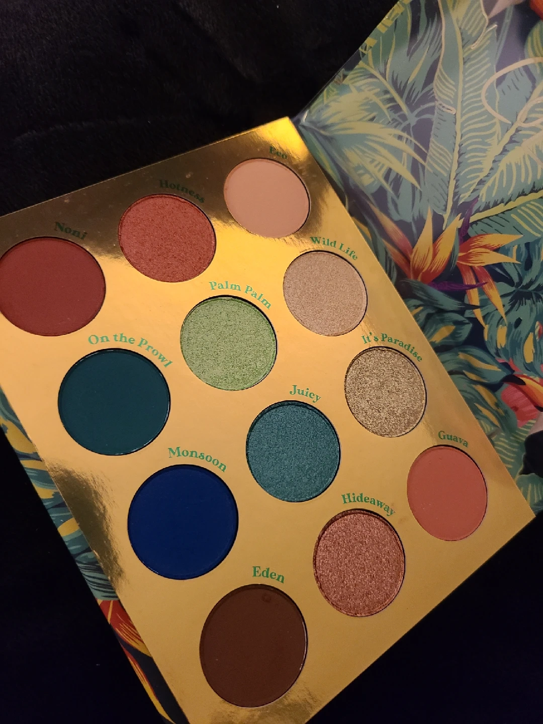 242ColourPop Lush Life eyeshadow palette. It features a variety of vibrant shades, perfect for creating tropical-inspired looks! The palette includes colours like Eco, Wild Life, It's Paradise, Guava, Hotness, Palm Palm, Juicy, Hideaway, Noni, On the Prowl, Monsoon, and Eden.