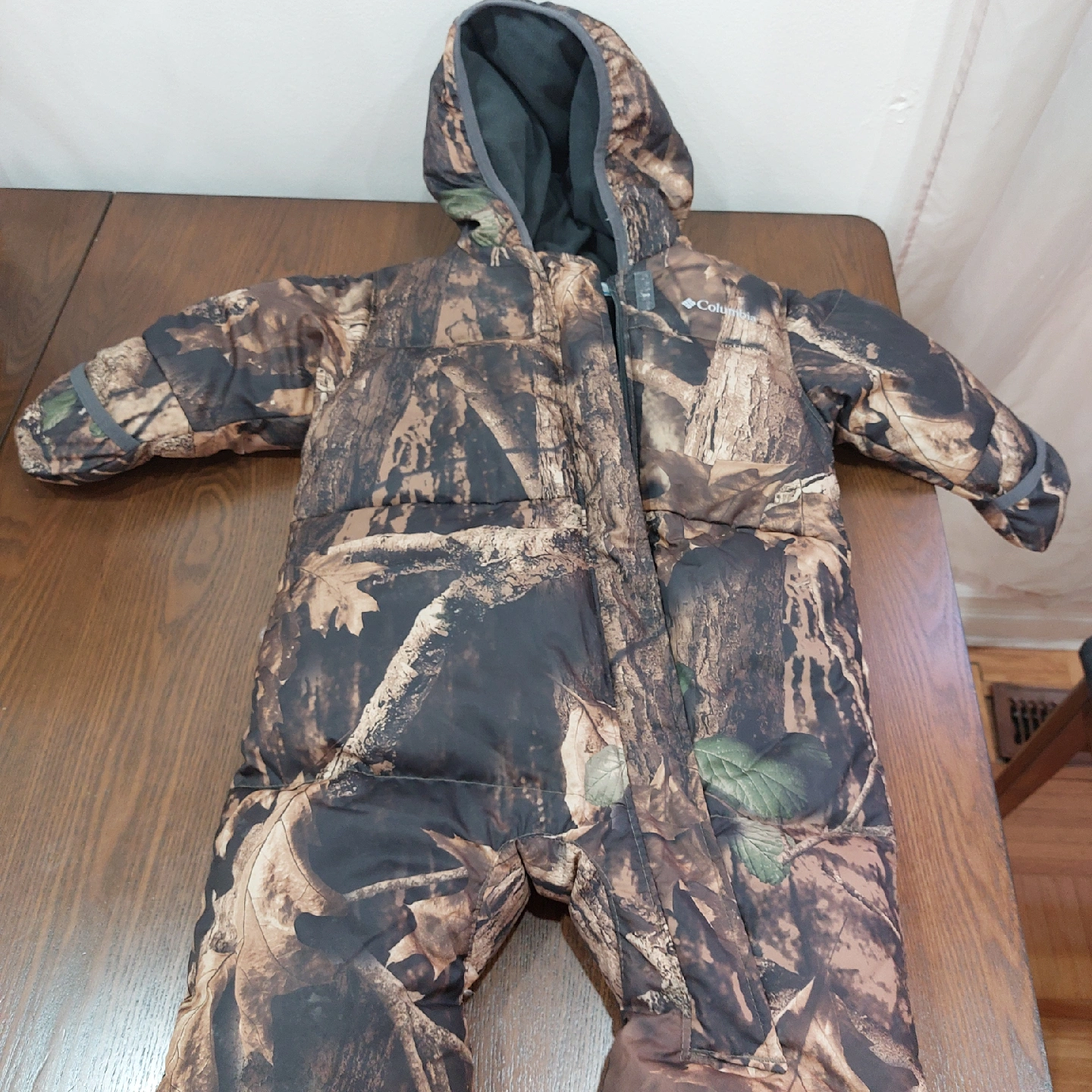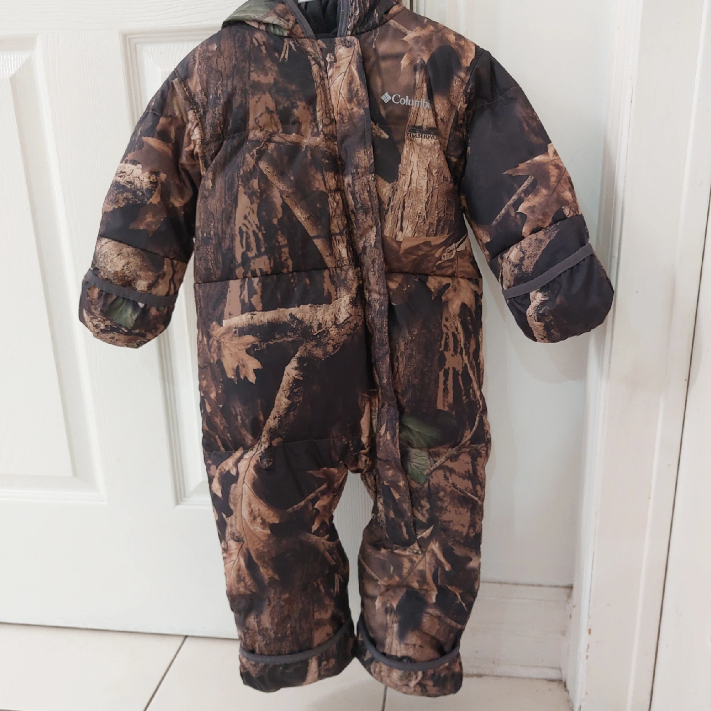 Keep your little one warm this winter with this Columbia baby snowsuit! It features a camo print and a cozy hood for extra protection from the elements. (Worn a few times)