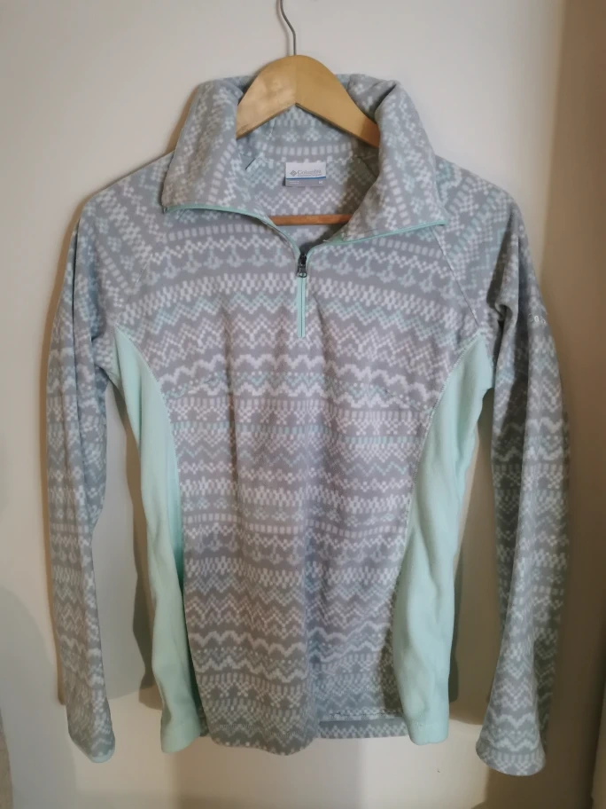 Cozy Columbia fleece pullover in a lovely grey and white pattern with light green accents! It's a size medium and perfect for layering or wearing on its own on milder days