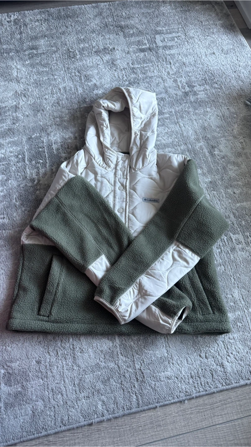 171Cozy Columbia jacket featuring a fleece lower half and quilted upper half! It's a size large and in great condition. Perfect for layering on chilly days! New but tags removed. Bought for 100€