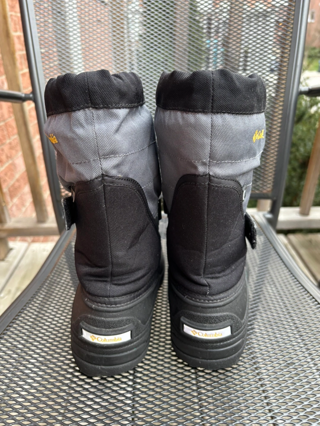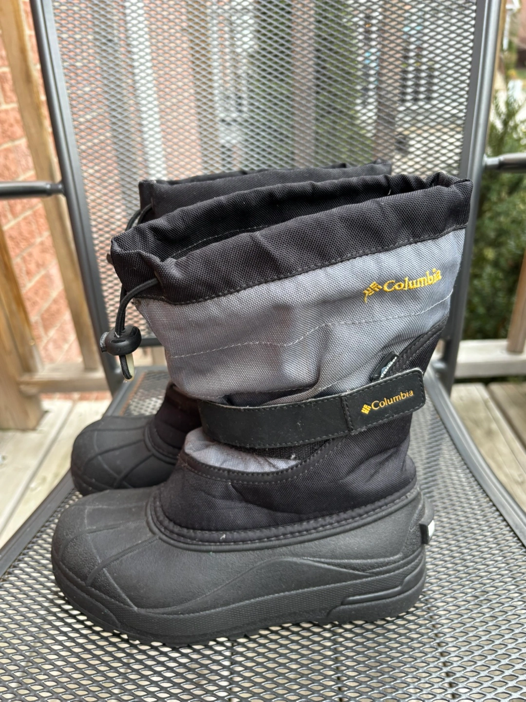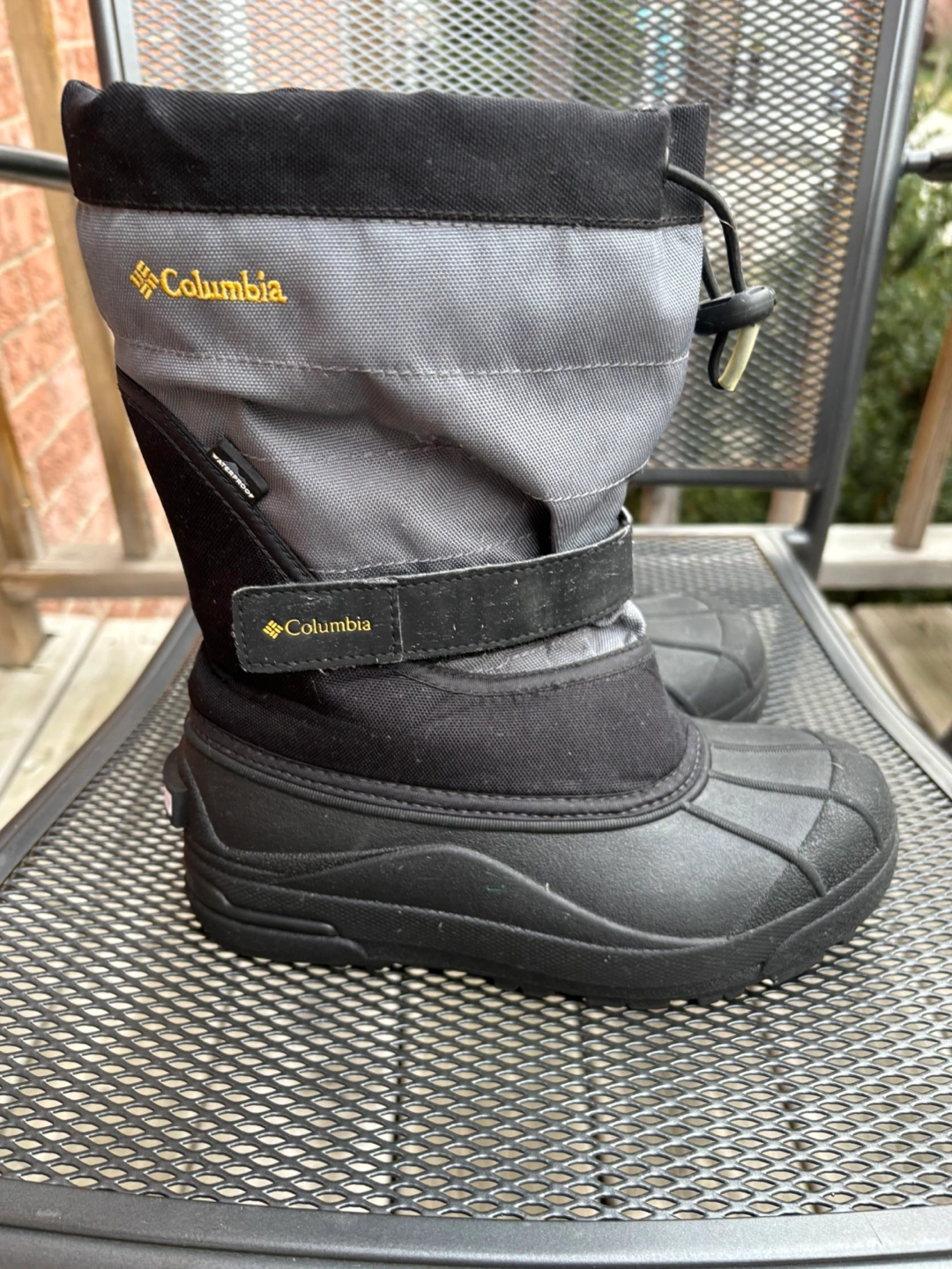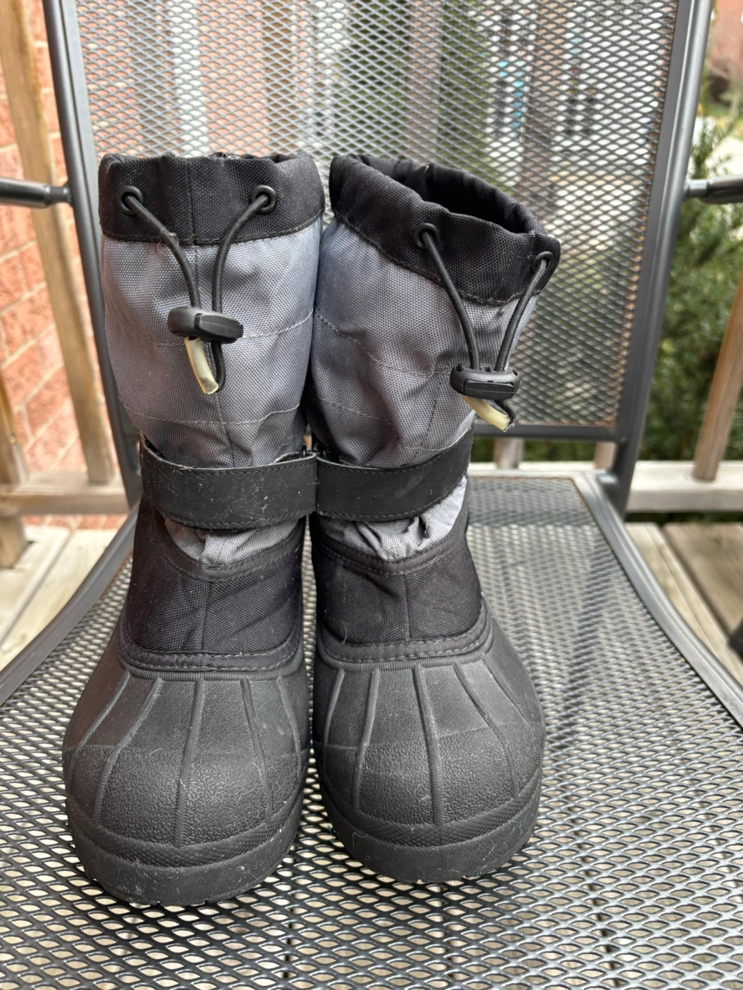 10Black and grey winter boots with a velcro strap and drawstring closure. Waterproof and insulated. Size 3.