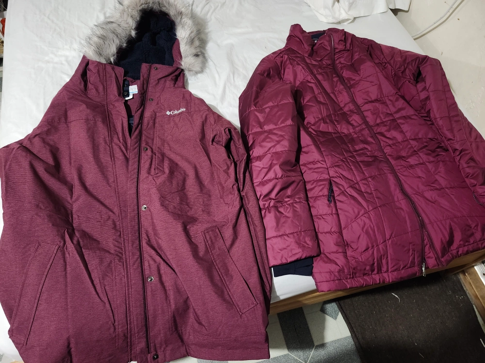 Two Columbia winter coats in a lovely maroon colour! One is a parka style with a faux fur-trimmed hood, and the other is a lighter, quilted jacket. Both are size large and in great condition! Perfect for staying warm this winter season