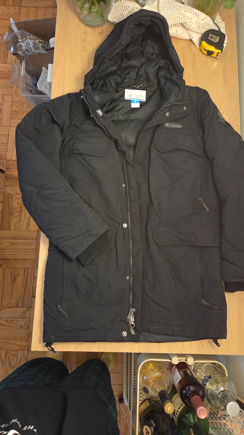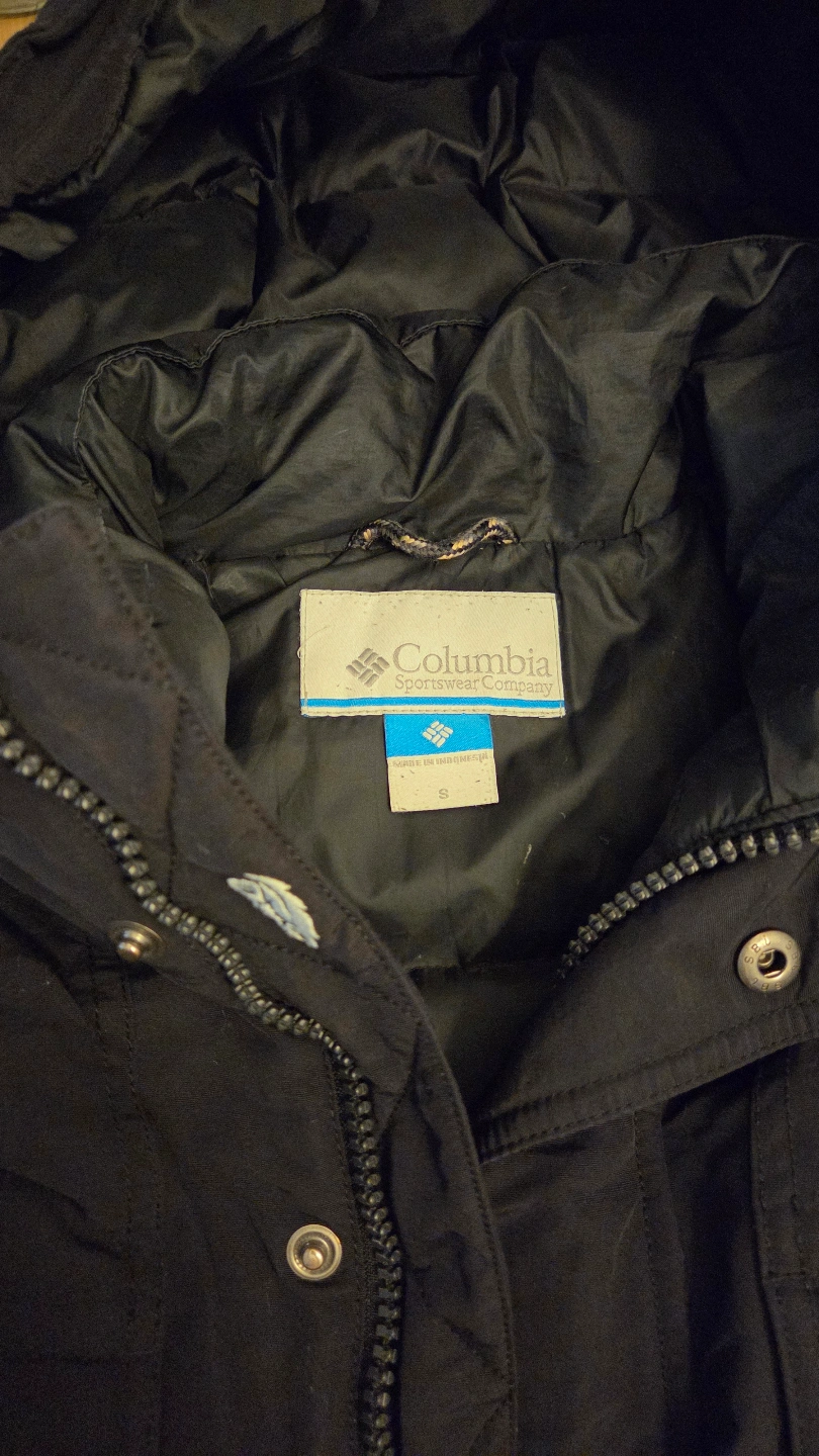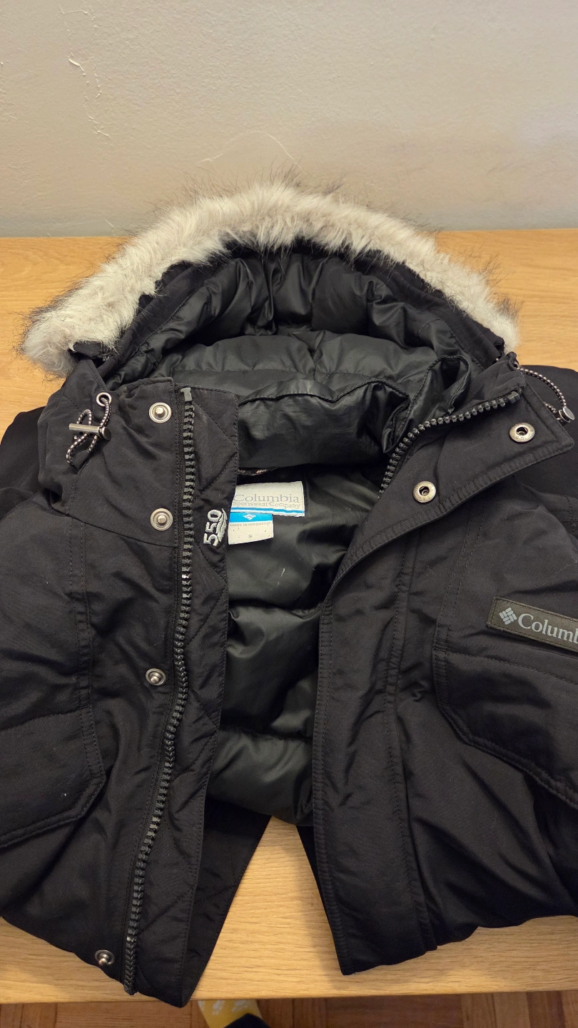 Black Columbia winter jacket. Size Small. Features a hood with faux fur trim. Multiple pockets. Zipper and button closure. Excellent condition.