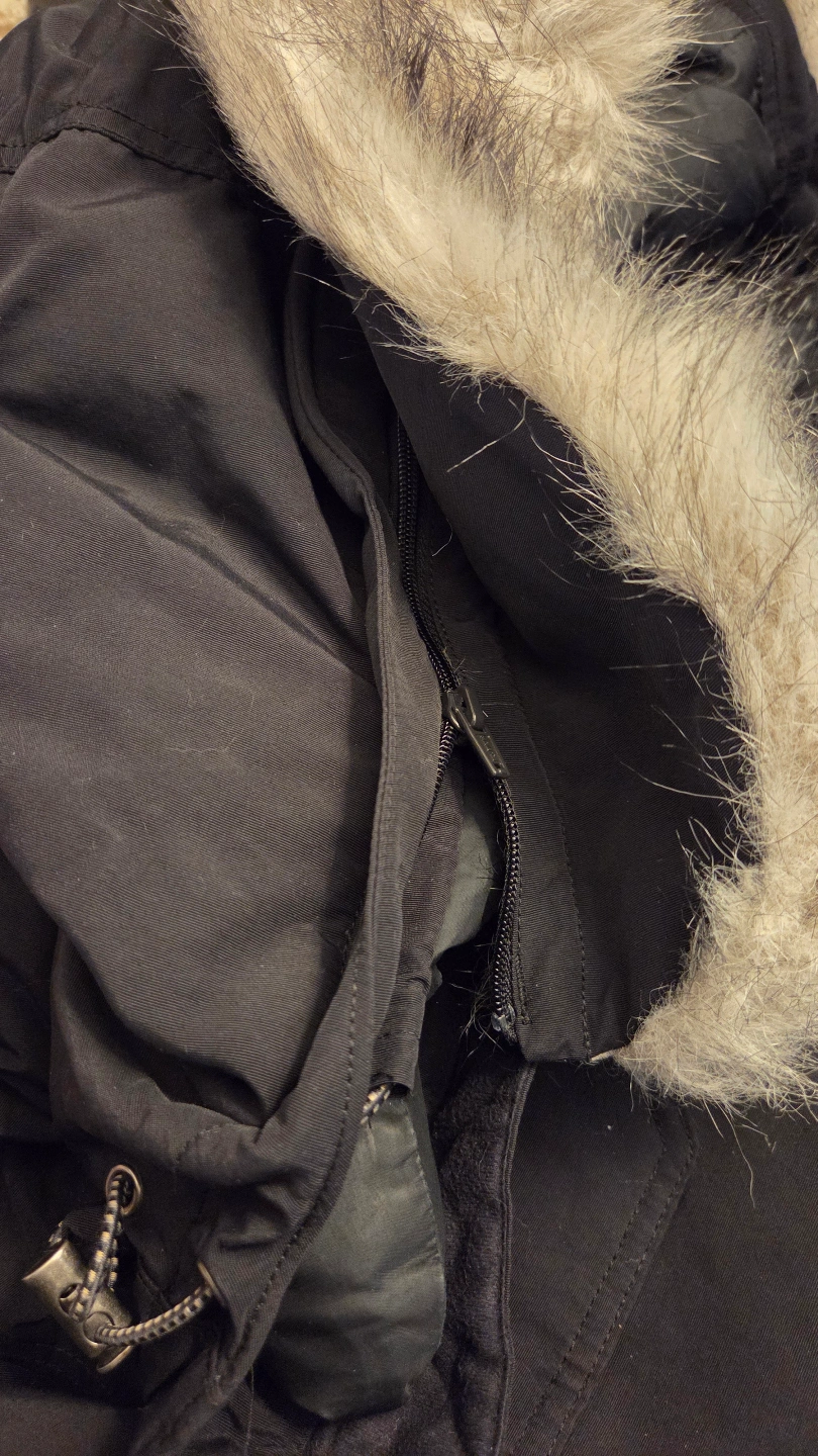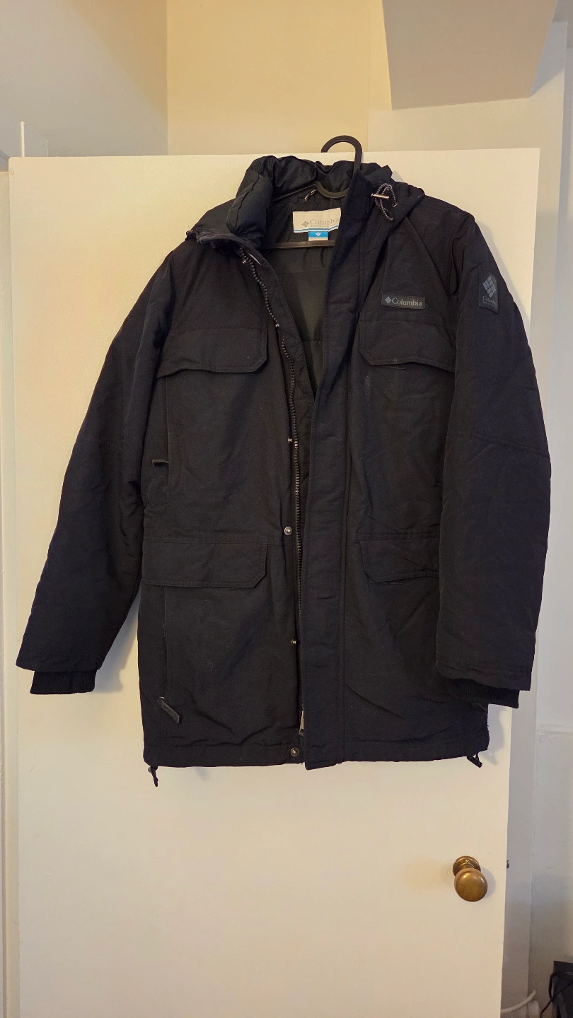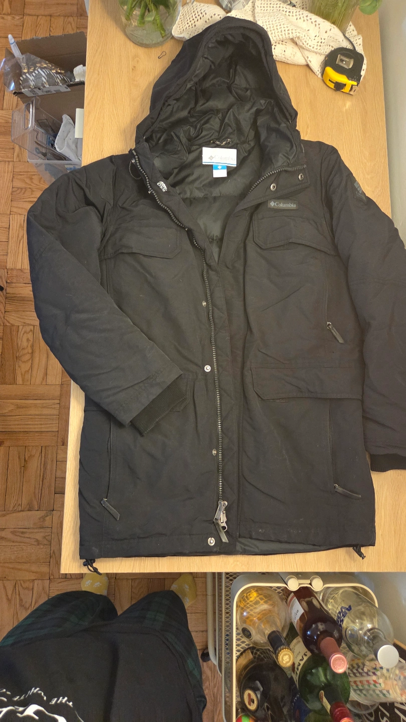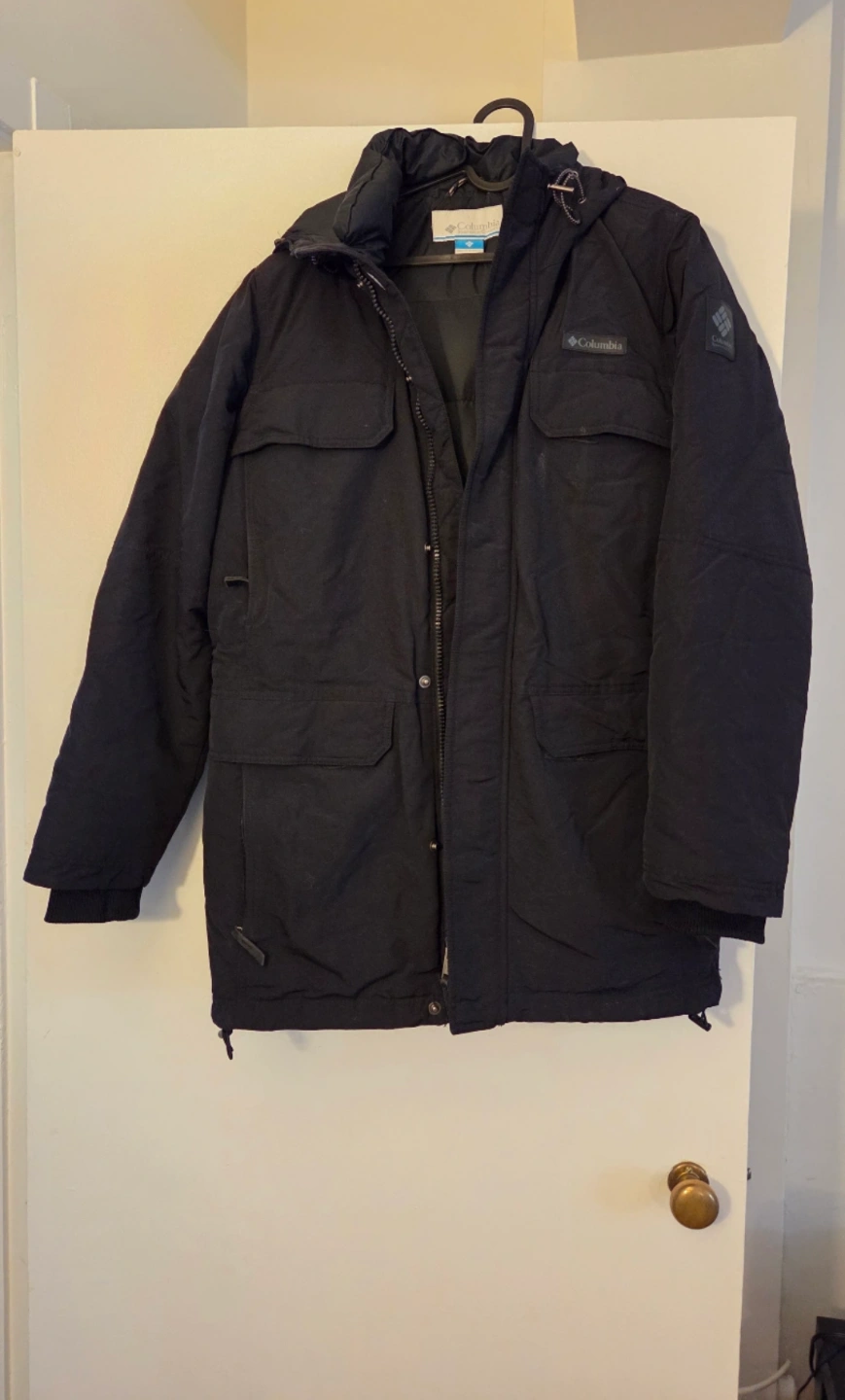 Black Columbia winter jacket. Size Small. Features a hood with faux fur trim. Multiple pockets. Zipper and button closure. Excellent condition.