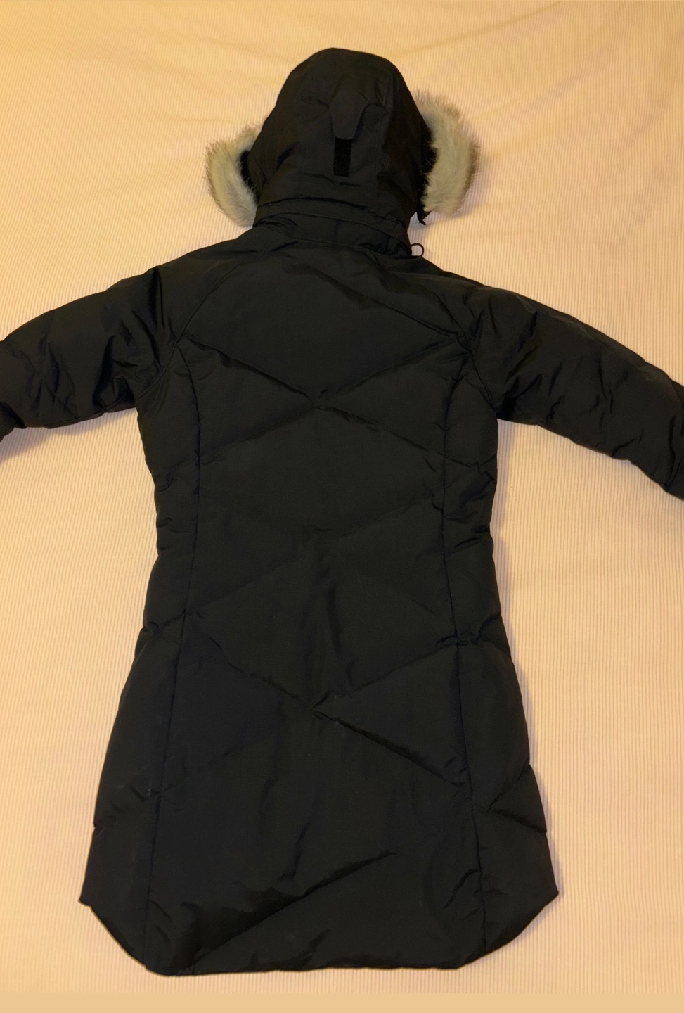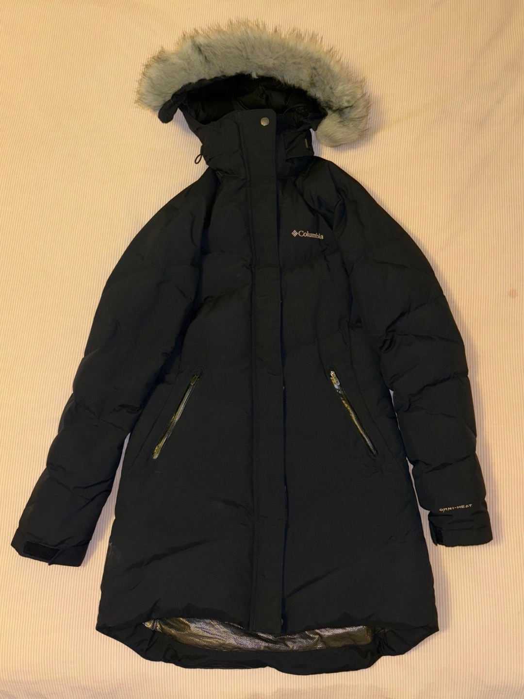 Black winter parka with a fur-lined hood . Pockets.