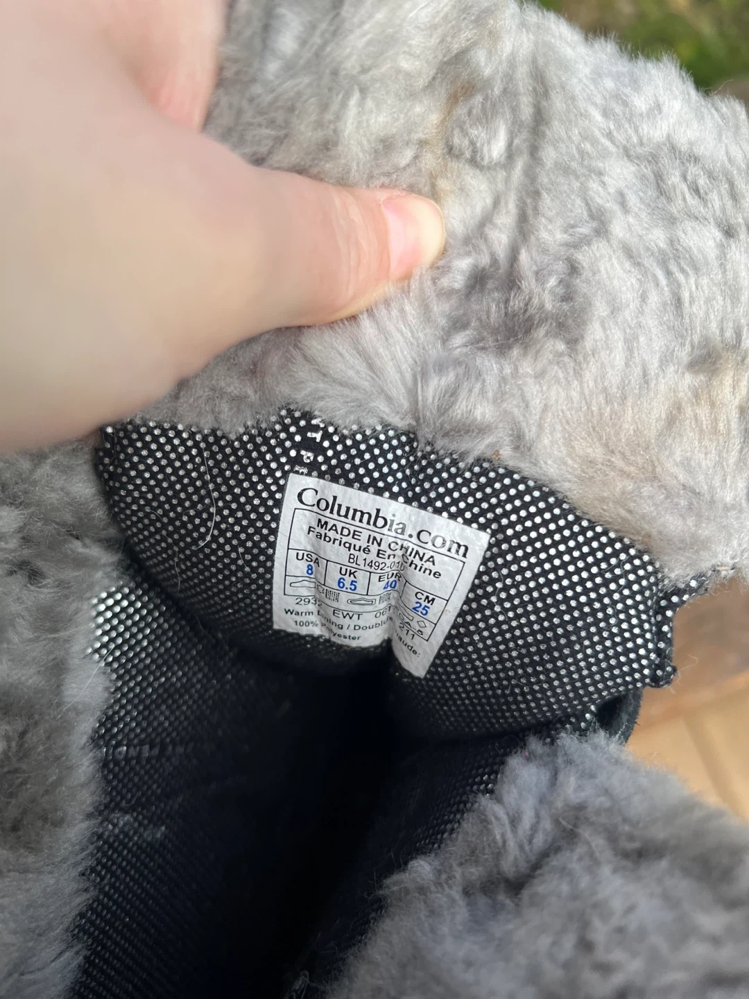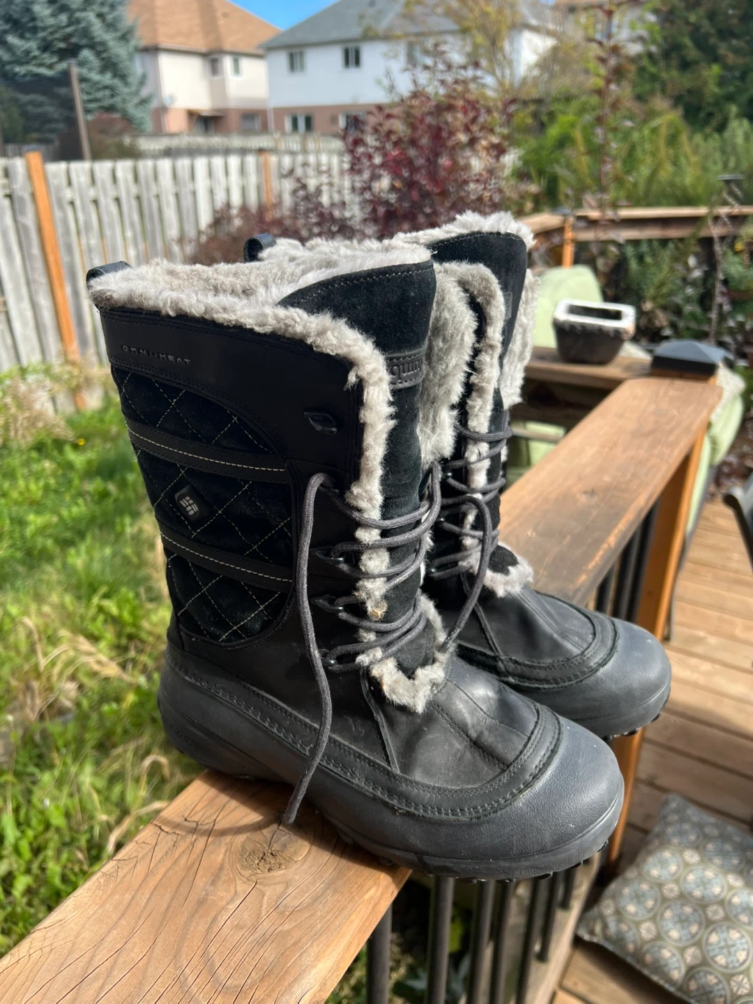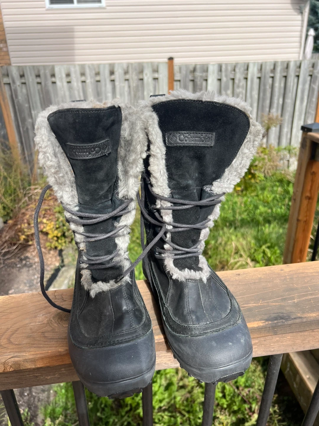 86Cozy Columbia winter boots ready for the snow! They're a women's size 8. The boots are black with grey faux fur trim. Perfect for keeping your feet warm and dry this winter season