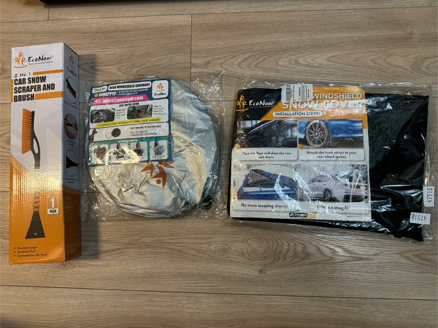326Get ready for winter with this EcoNour set! It includes a 2-in-1 car snow scraper and brush to clear off your windows and a windshield snow cover to keep the ice off. Also included is a rear windshield sunshade. No more scraping chores!