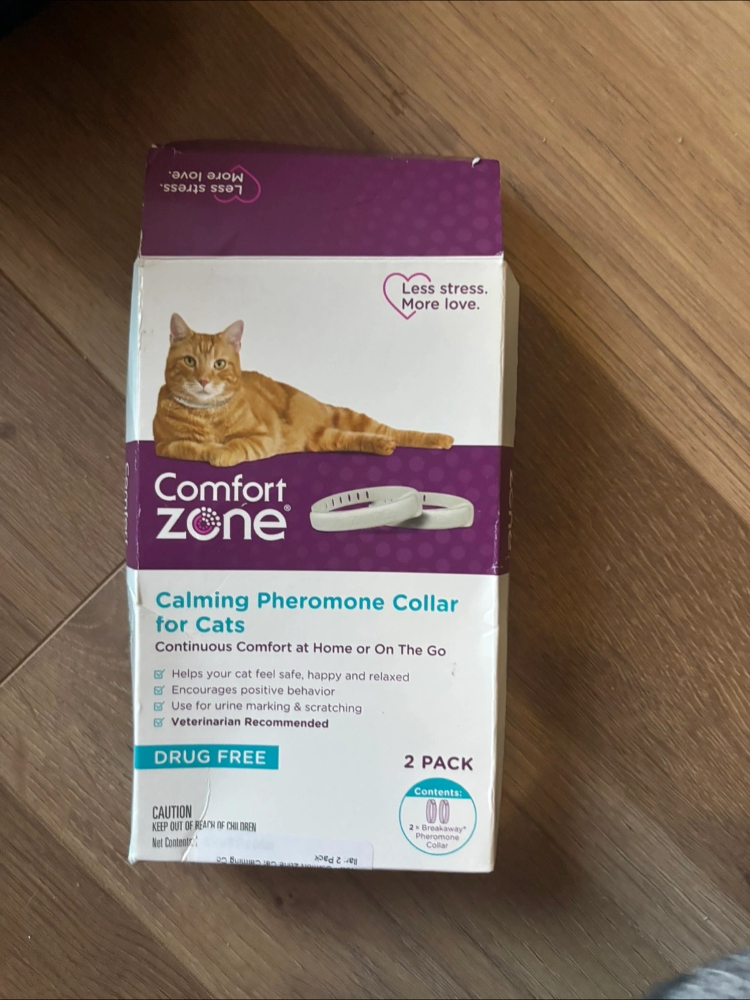 I'm selling a Comfort Zone Calming Pheromone Collar for Cats! This is a 2-pack, designed to provide continuous comfort at home or on the go. It helps your cat feel safe, happy, and relaxed, encourages positive behaviour, and helps with urine marking and scratching. Veterinarian recommended! ****Only one in package ****