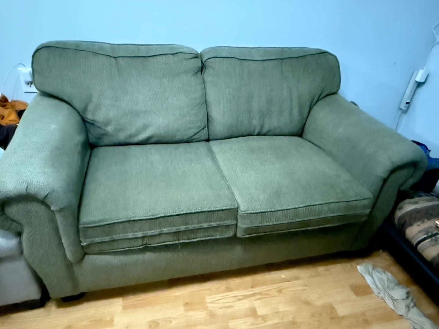 10This cozy 2-seater sofa is perfect for any living room, apartment, or office space. It features: Soft, durable fabric in a neutral olive-green tone that complements any décor Thick cushions for great comfort and support Sturdy wooden frame and legs ensuring long-lasting durability Well-maintained – from a non-smoking, no-pet home Ideal for relaxing, reading, or adding extra seating to your space. Clean and ready to use — just pick up and enjoy! 📏 Approximate dimensions: (1.59 m wide * 68 cm
