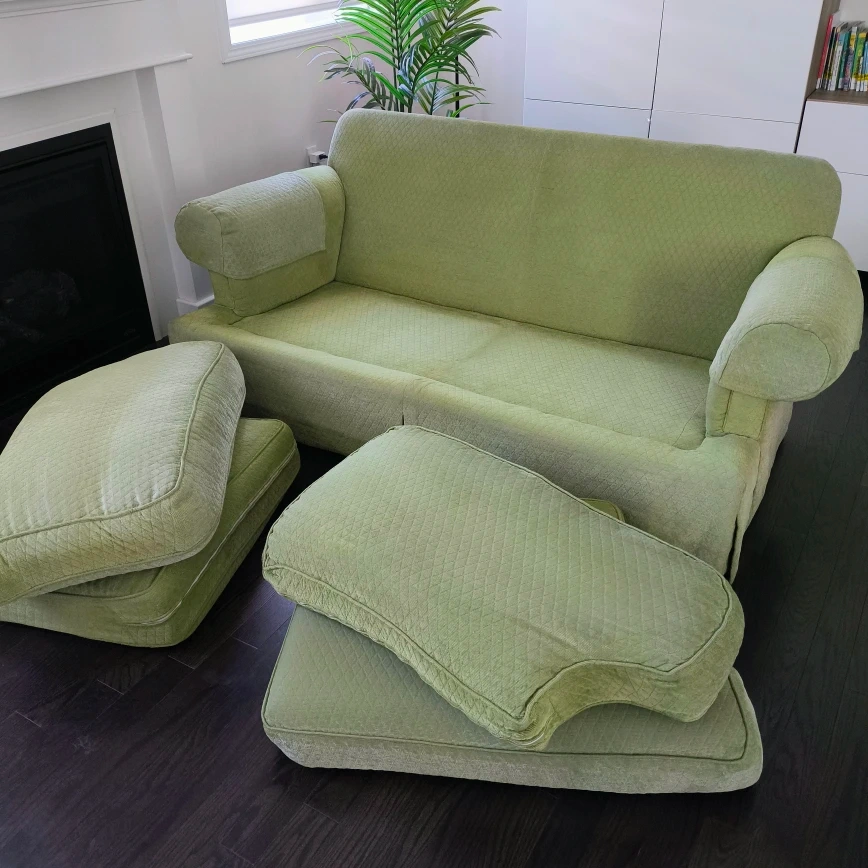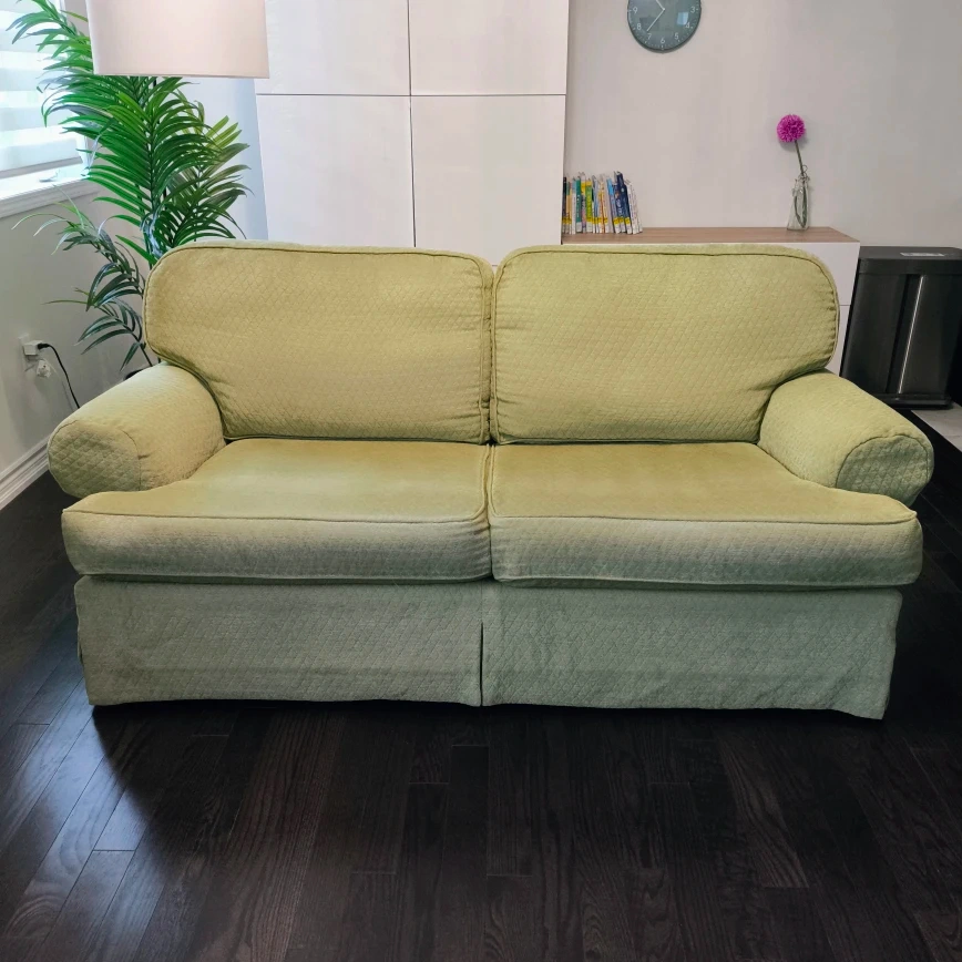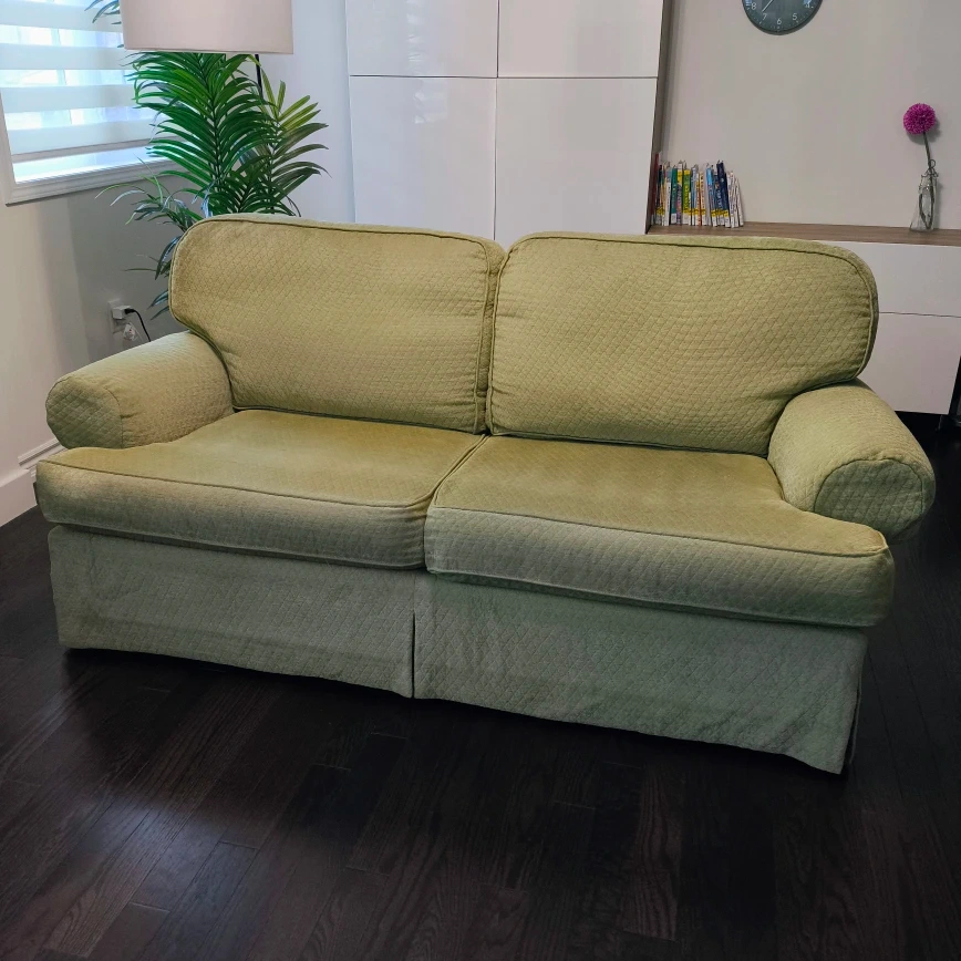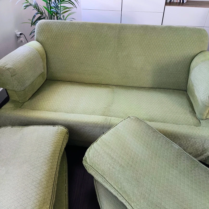 73Classic rolled-arm 3-seater sofa with removable washable covers – great condition! Spacious and cozy sofa (approx. 200cm W x 95cm D x 95cm H) – comfortably seats 3 adults or a family of 4. All cushions are removable with washable covers for easy cleaning. The fabric and frame are in excellent condition with no rips, stains, or damage. Neutral light green color fits easily with any home decor. Very clean and well cared for – ready to use right away!
