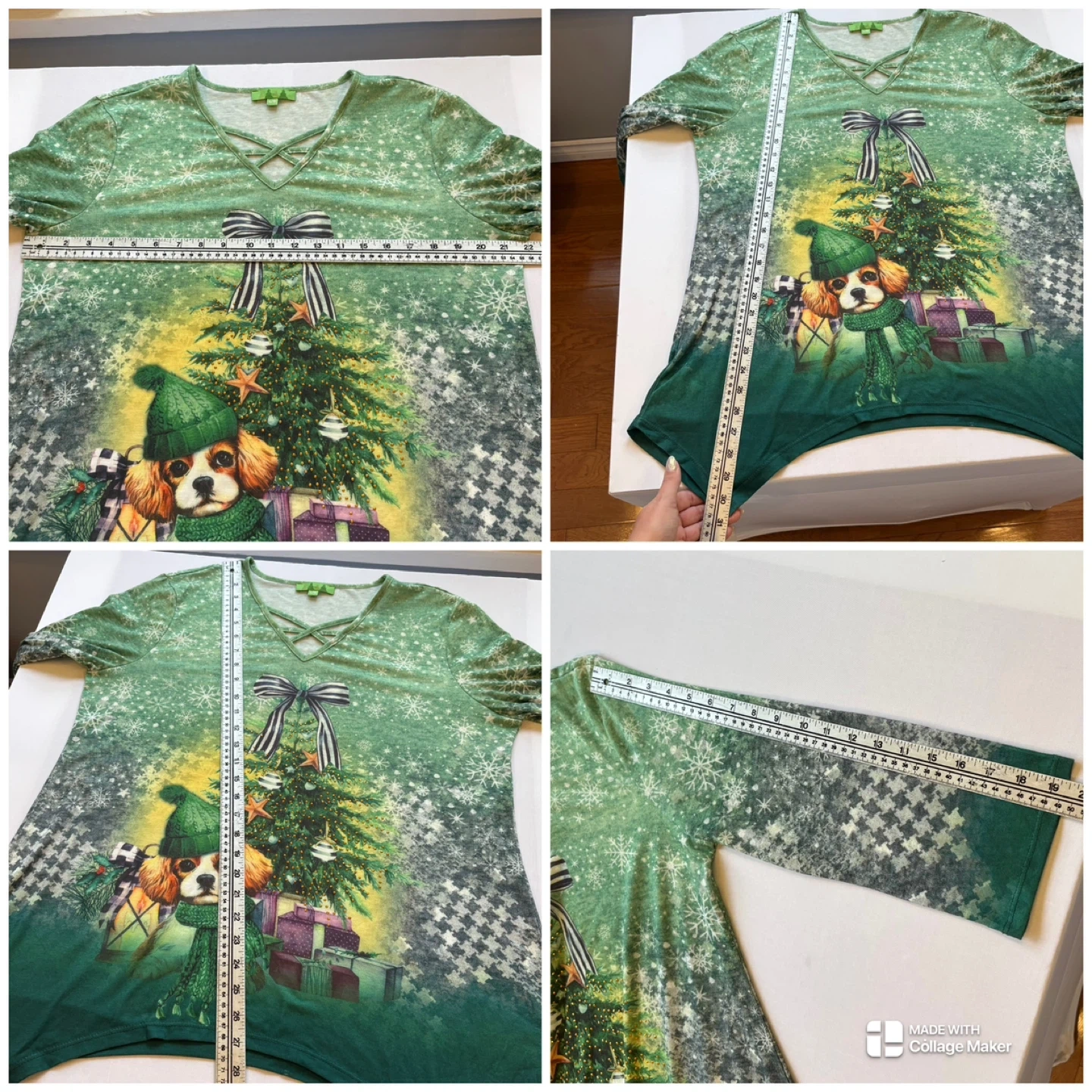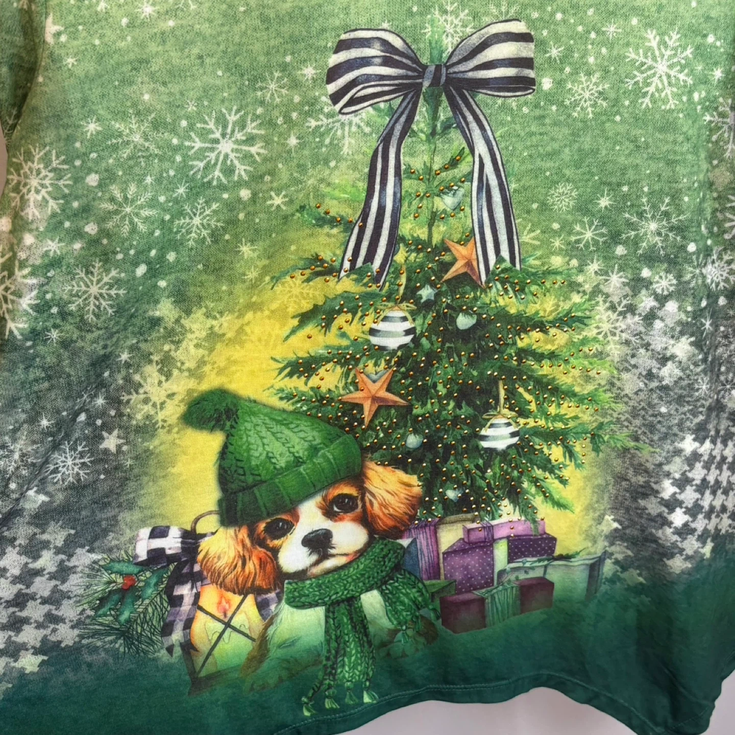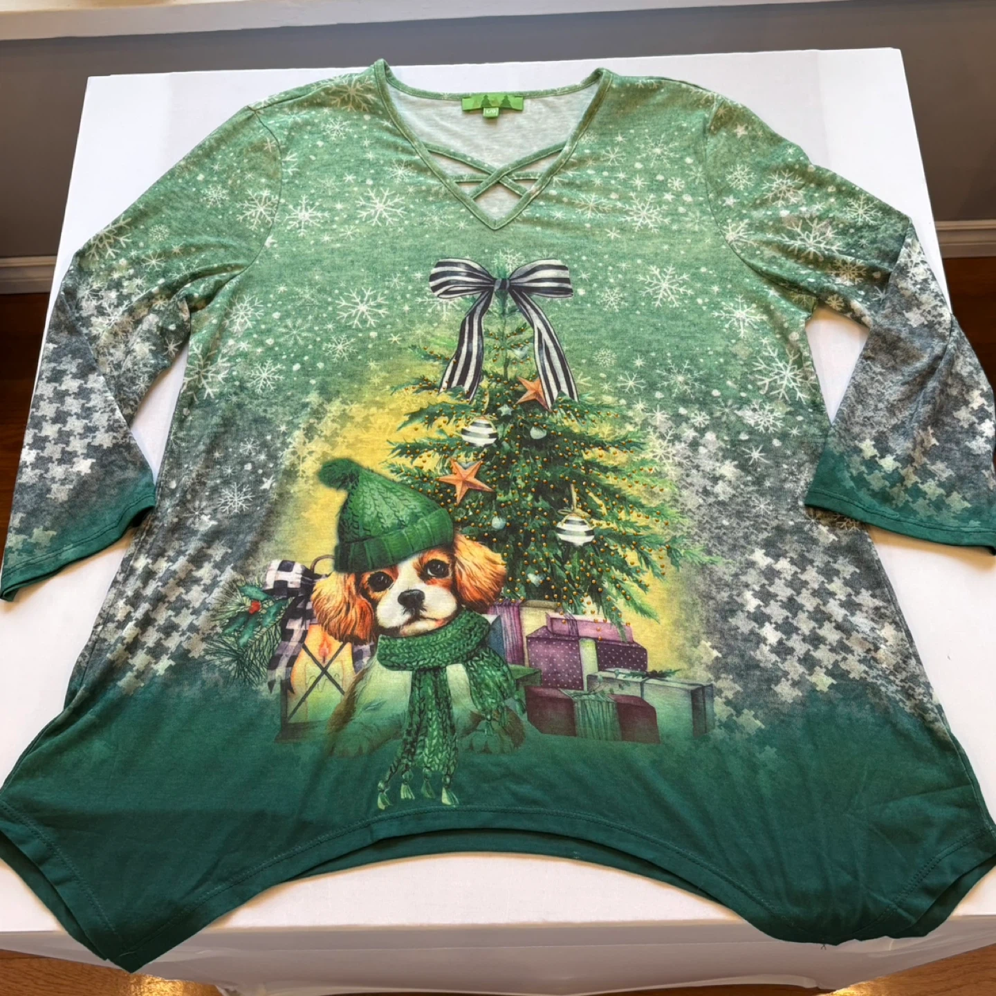122Get into the holiday spirit with this adorable Christmas tunic top from Canada's Comfy Cozy Christmas Store. This long-sleeve top features a charming and detailed graphic print of a Cavalier King Charles Spaniel wearing a green toque and scarf, sitting next to a decorated Christmas tree with presents. The all-over print includes snowflakes and a gradual ombre effect from lime green to deep forest green. The criss-cross V-neck and sharkbite hem add a stylish, comfortable touch, making this the perfect piece for casual holiday gatherings or a cozy day in. The material is a soft and stretchy polyester blend, ensuring comfort and a great fit. Keywords: holiday, Christmas, winter, festive, seasonal, comfort, cozy, graphic, dog, puppy, Cavalier, spaniel, long sleeve, tunic, top, vneck, green, snowflake, ombre, tree, present, new, Canada New without tags! Brand: Canada’s Comfy Cozy Christmas Store Era: Modern Color: Green, White, Yellow Print: Dog, Christmas Tree, Snowflake, Ombre, Graphic Material: 95% Polyester, 5% Spandex Condition: New, never worn. Size: L See photos for measurements. Flaws: None noted Cross posted. Winnipeg - Pick up only (Located 2 blocks west of Polo Park). Shipping options available through other platforms message me for details.