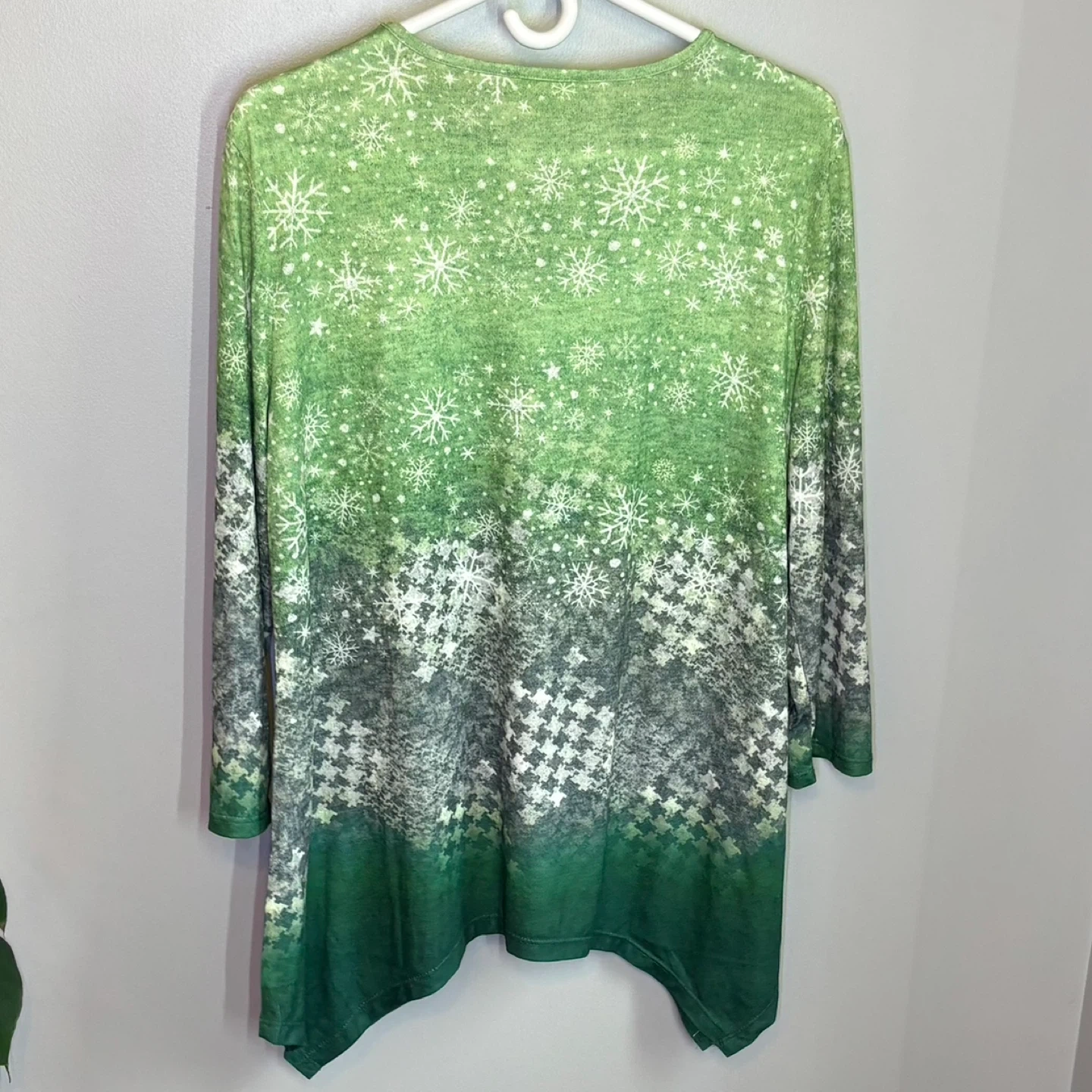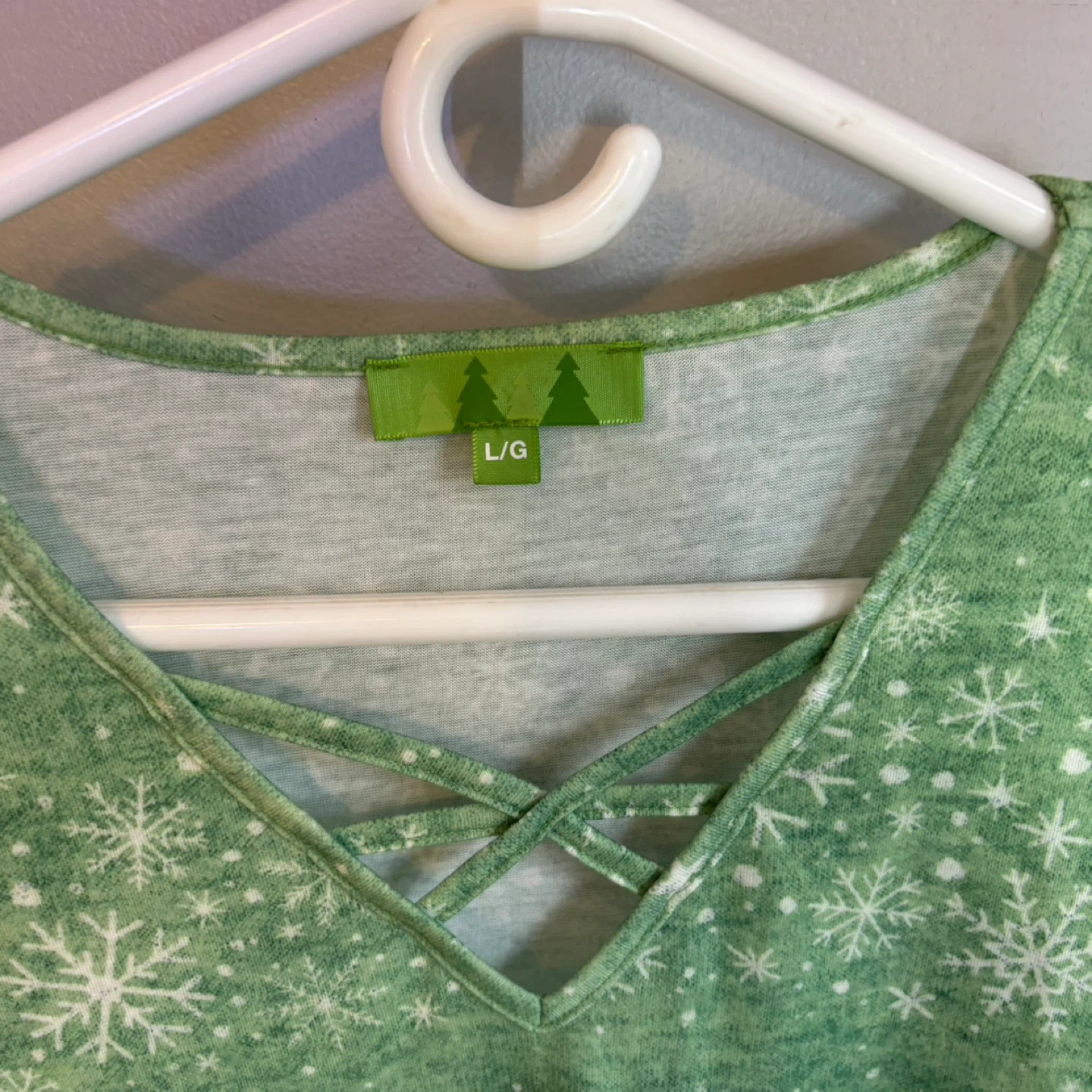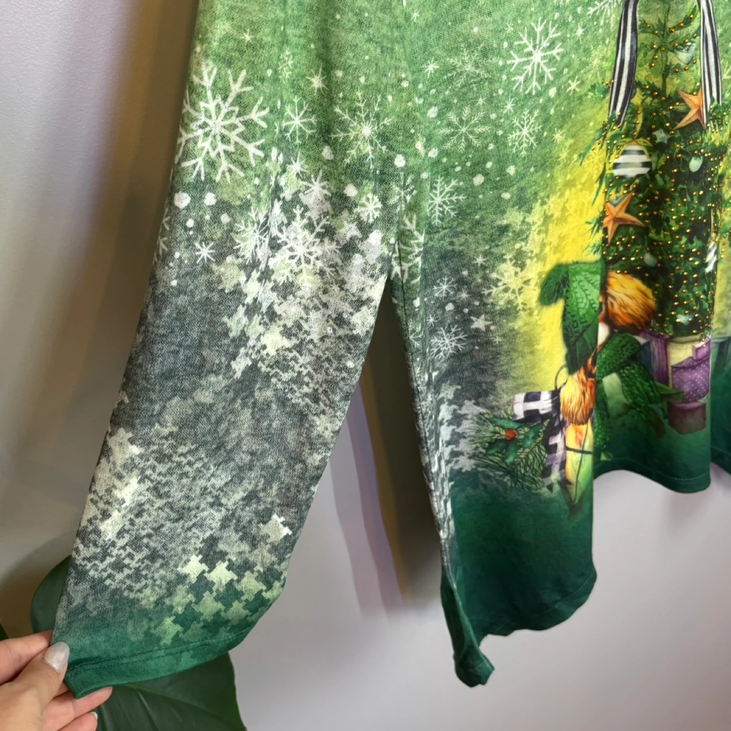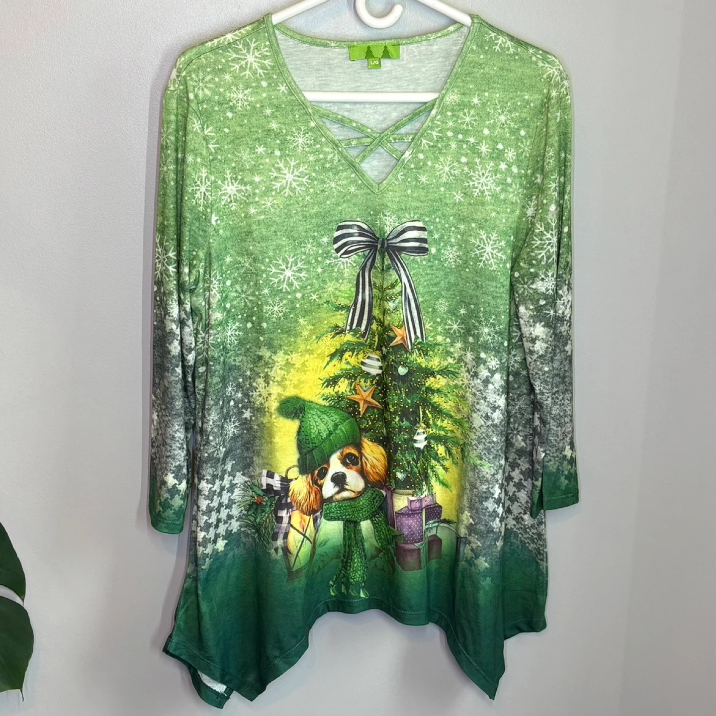 122Get into the holiday spirit with this adorable Christmas tunic top from Canada's Comfy Cozy Christmas Store. This long-sleeve top features a charming and detailed graphic print of a Cavalier King Charles Spaniel wearing a green toque and scarf, sitting next to a decorated Christmas tree with presents. The all-over print includes snowflakes and a gradual ombre effect from lime green to deep forest green. The criss-cross V-neck and sharkbite hem add a stylish, comfortable touch, making this the perfect piece for casual holiday gatherings or a cozy day in. The material is a soft and stretchy polyester blend, ensuring comfort and a great fit. Keywords: holiday, Christmas, winter, festive, seasonal, comfort, cozy, graphic, dog, puppy, Cavalier, spaniel, long sleeve, tunic, top, vneck, green, snowflake, ombre, tree, present, new, Canada New without tags! Brand: Canada’s Comfy Cozy Christmas Store Era: Modern Color: Green, White, Yellow Print: Dog, Christmas Tree, Snowflake, Ombre, Graphic Material: 95% Polyester, 5% Spandex Condition: New, never worn. Size: L See photos for measurements. Flaws: None noted Cross posted. Winnipeg - Pick up only (Located 2 blocks west of Polo Park). Shipping options available through other platforms message me for details.