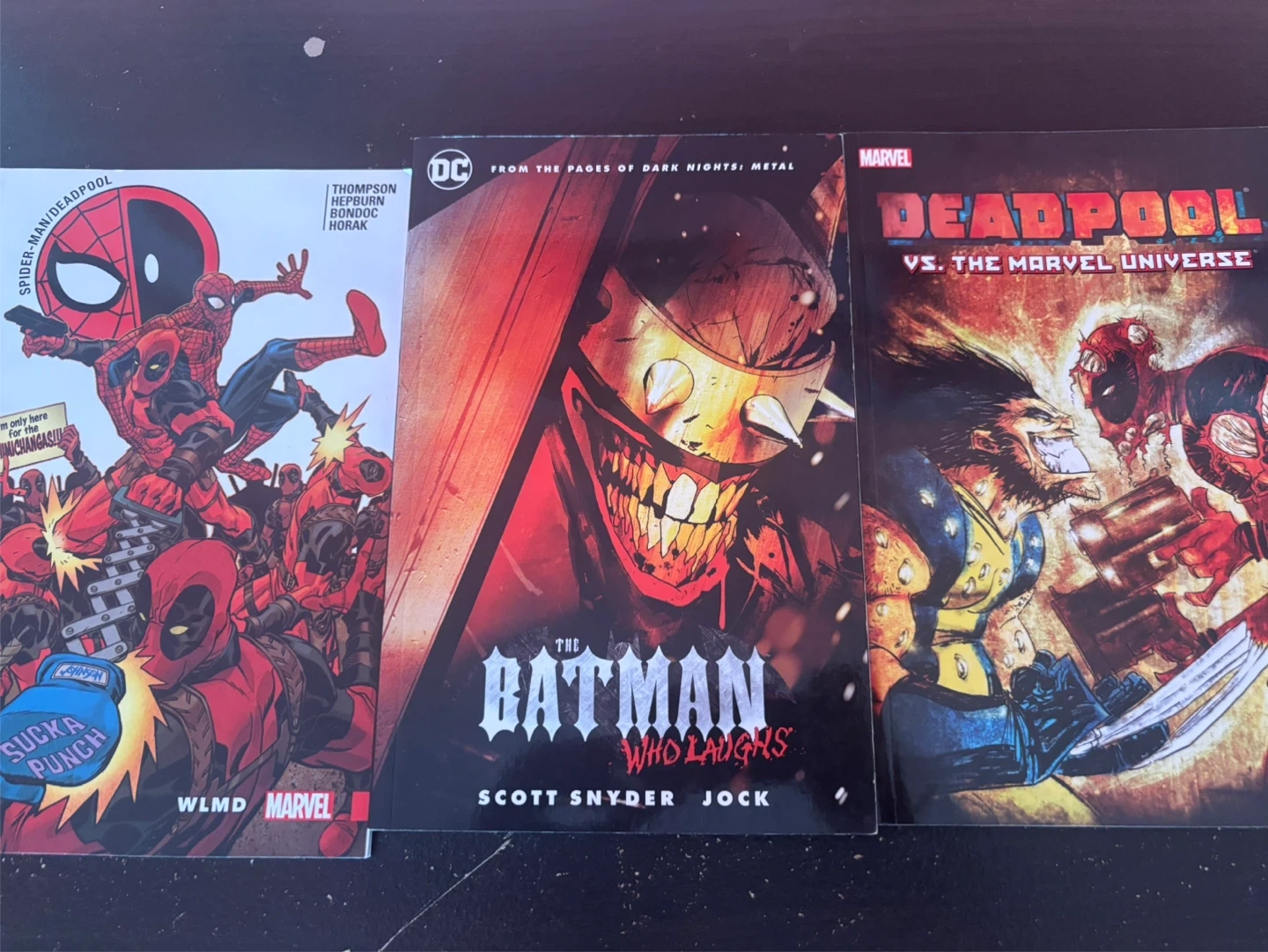 Selling a bundle of Marvel and DC comic books. 13 each or 65 for all of them. The Joker: Killer Smile is a freebie if you get multiple comics! Comics Im selling: Spider-Man/Deadpool WLMD The Batman Who Laughs Deadpool vs. The Marvel Universe Venom Homecoming Max Terror Inc: Apocalypse Soon DKIII The Master Race (crazy name ik) Meetup is at Yorkgate Mall.