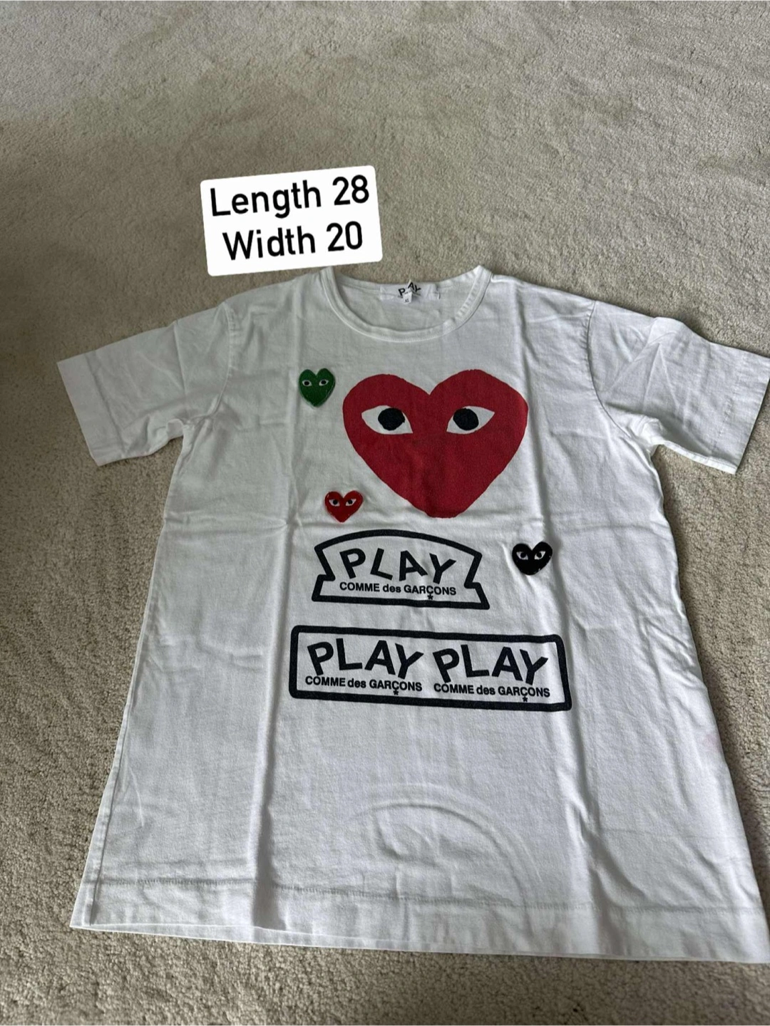 Selling a Comme des Garçons PLAY T-shirt. The shirt is white and features the iconic heart logo with eyes. The length is 28 inches and the width is 20 inches