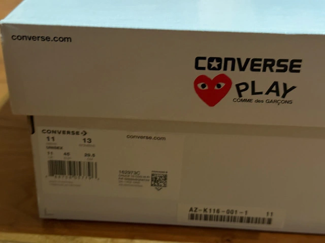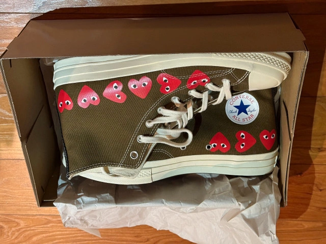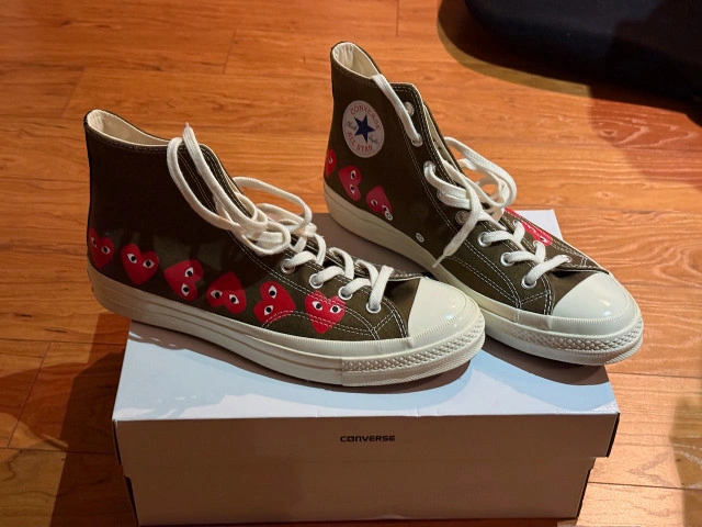 67Comme des Garçons PLAY x Converse Chuck Taylor 70s – Olive Green. New condition, Olive Green with Red Heart logos. Model #: 162973C. Original Box included. These Chuck Taylor 70 High-Tops feature the signature red heart logos designed by Rei Kawakubo, premium canvas construction, and upgraded cushioning. Unisex size 11 Men’s / 13 Women’s. Authentic release (Made in Vietnam). Includes original box and paper. No marks, scuffs, or wear on soles. Asking: $200 CAD (OBO). Pickup in Thornhill or GTA.