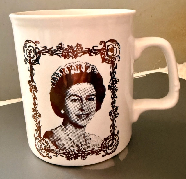 208Celebrate royal history with this Commemorative Queen Elizabeth II Silver Jubilee Mug, marking her reign from 1952-1977. The mug is adorned with a portrait of the Queen and commemorative text and symbols. It's in great shape, perfect for collectors of royal memorabilia! Own a piece of British history, as delightful for display as it is for enjoying your daily cuppa. This mug is sure to bring a touch of regal charm to your home. If the ad is up, it's available.