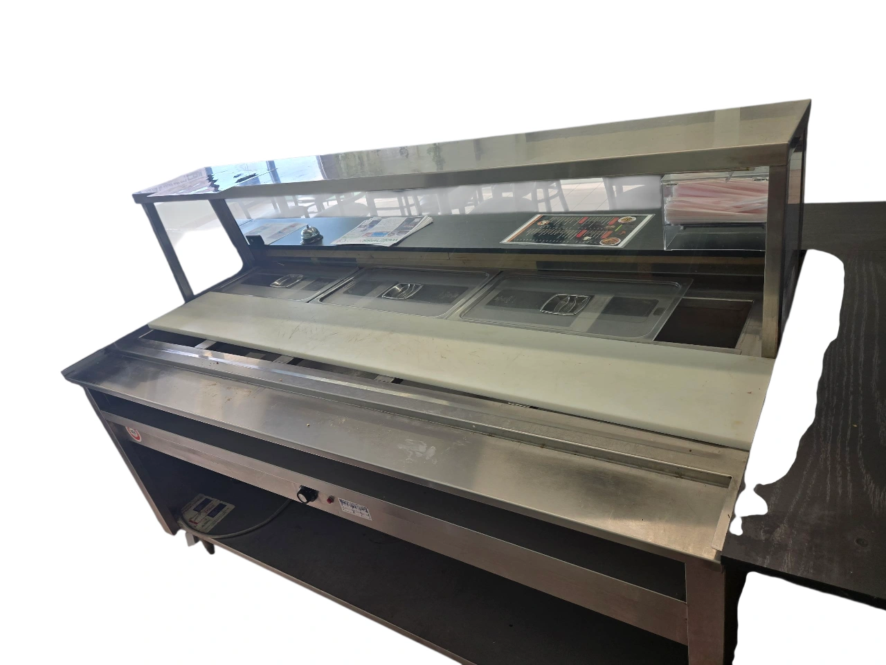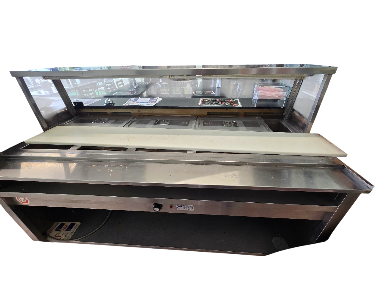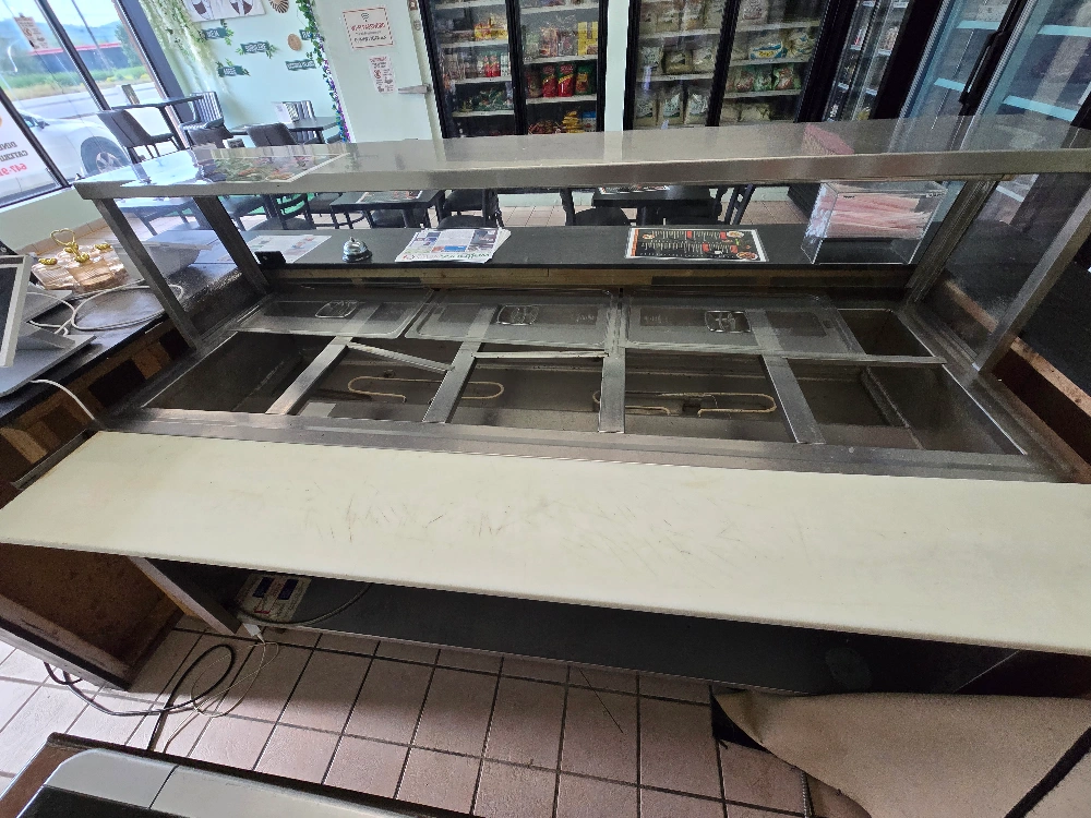 This is a commercial food warmer and display case. It appears to be in good condition and ready for use in a restaurant or food service setting. It has a stainless steel finish and a glass display case on top. It would be perfect for keeping food warm and displaying it to customers.