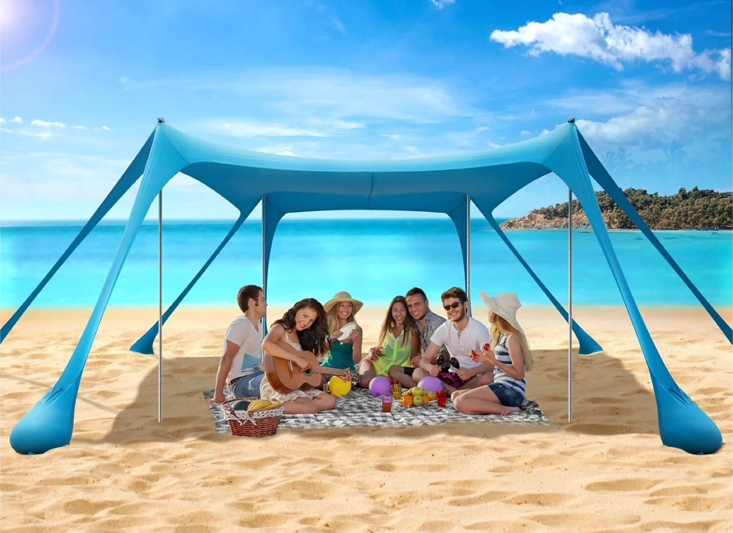 94COMMOUDS Beach Tent - BNIB Camping/ Sun Shelter with UPF50+ Protection, Sand Shovels, Ground Pegs and 4 Stability Poles, Outdoor Pop Up Beach Shade Canopy for Fishing, Backyard or Picnics etc See pics for measurements 7x7 model - Light Blue