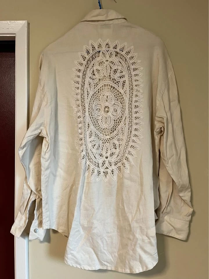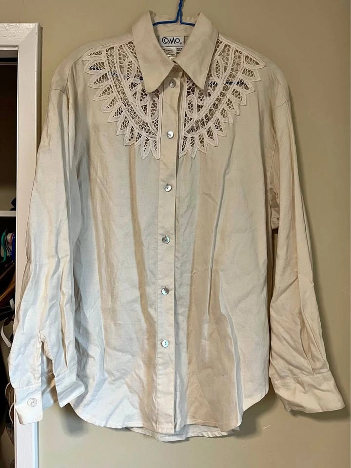 Como Linen Blouse with peek-a-boo front and back lace Size 10 Sorry about the wrinkles, I need to get a new iron.
