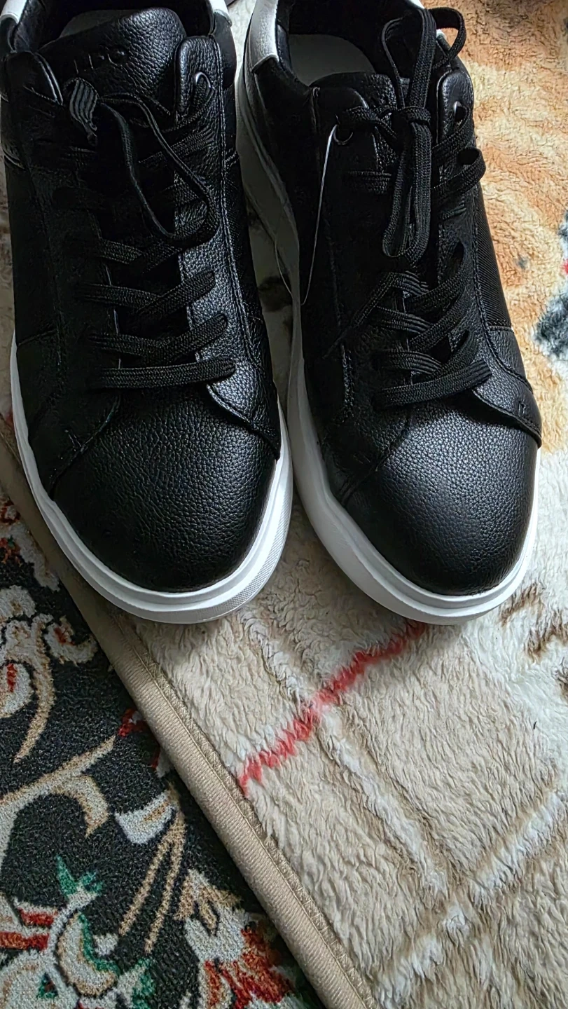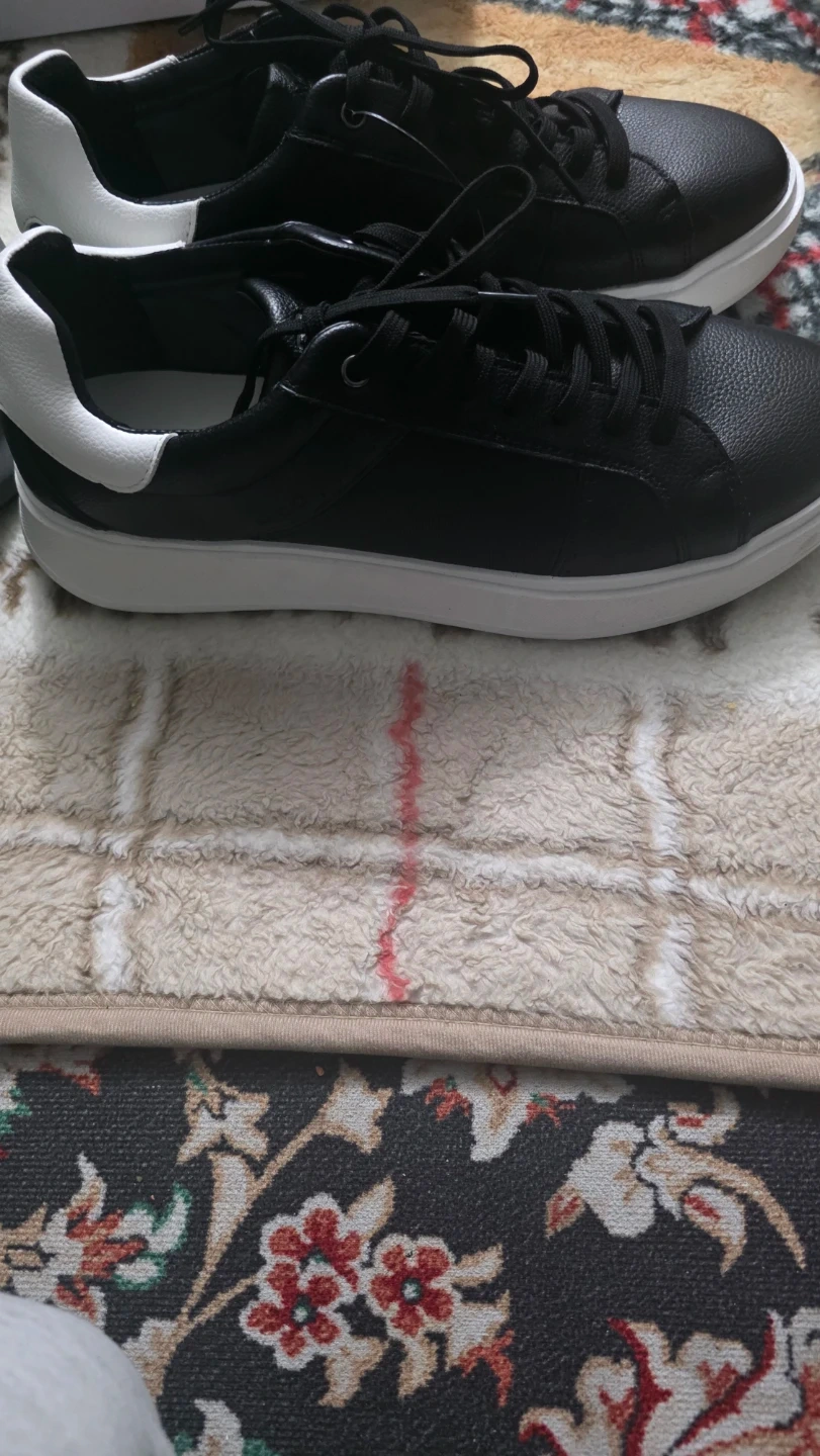 ALDO men's black leather sneakers. These stylish kicks feature a classic lace-up design with a contrasting white heel tab. The US size is 10. They're made in China. These sneakers are suitable for everyday wear.