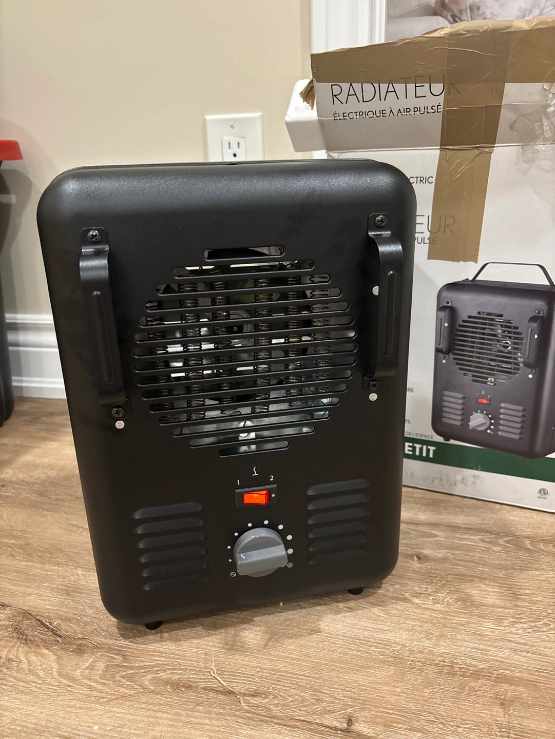Small black electric heater. Two heat settings. Portable design. Includes carrying handle.
