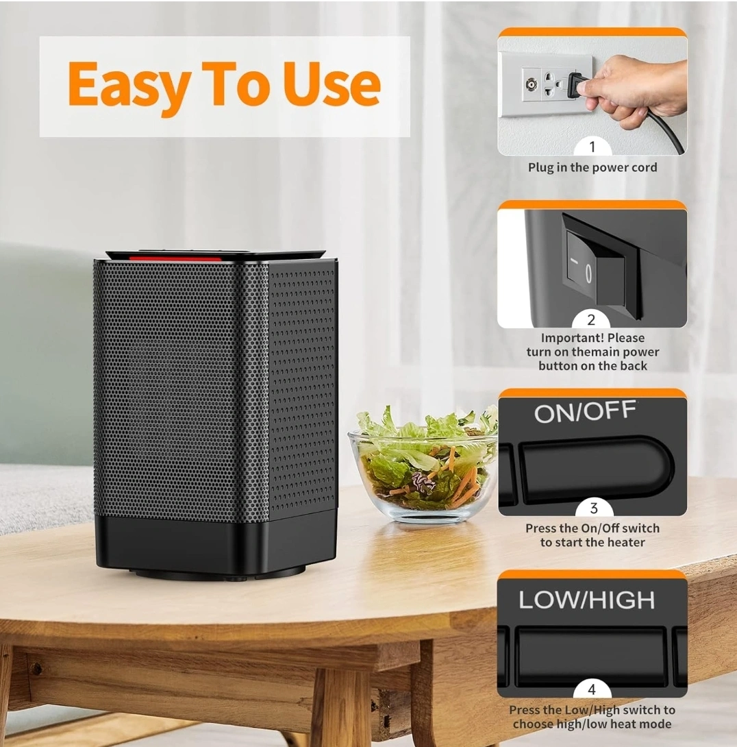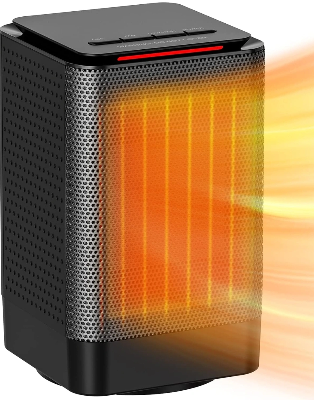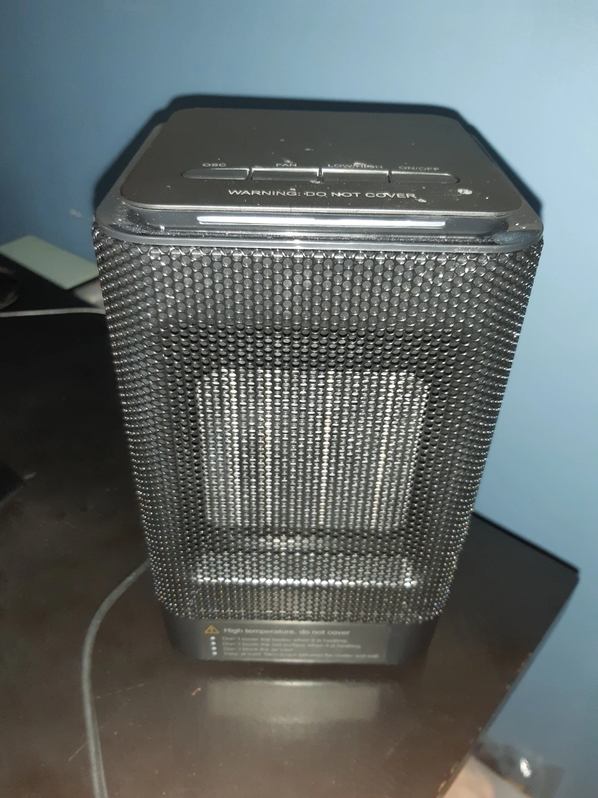 60Portable electric heater. Features three settings: off, fan, low/high heat. Black with mesh front. Good for small spaces.