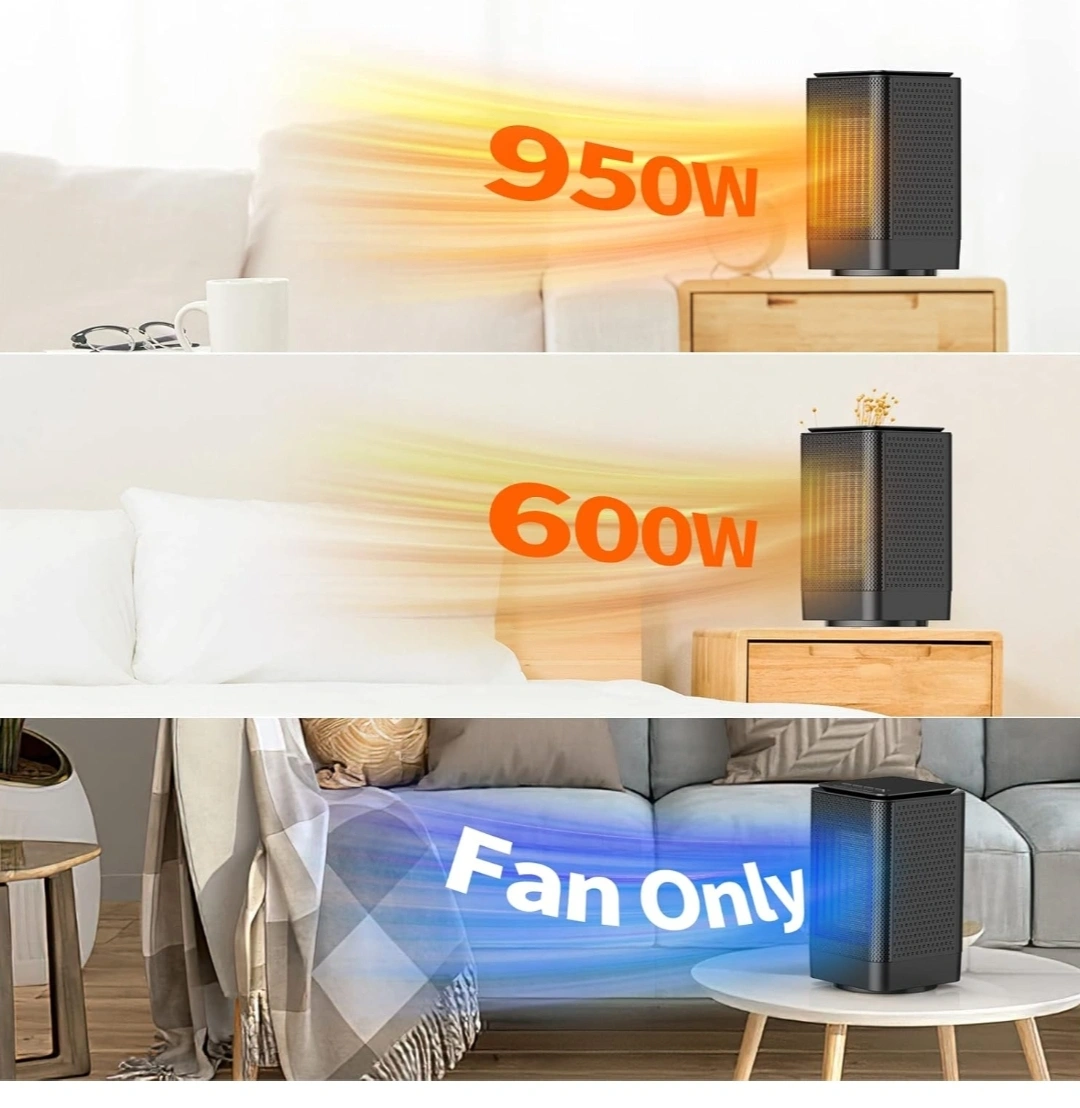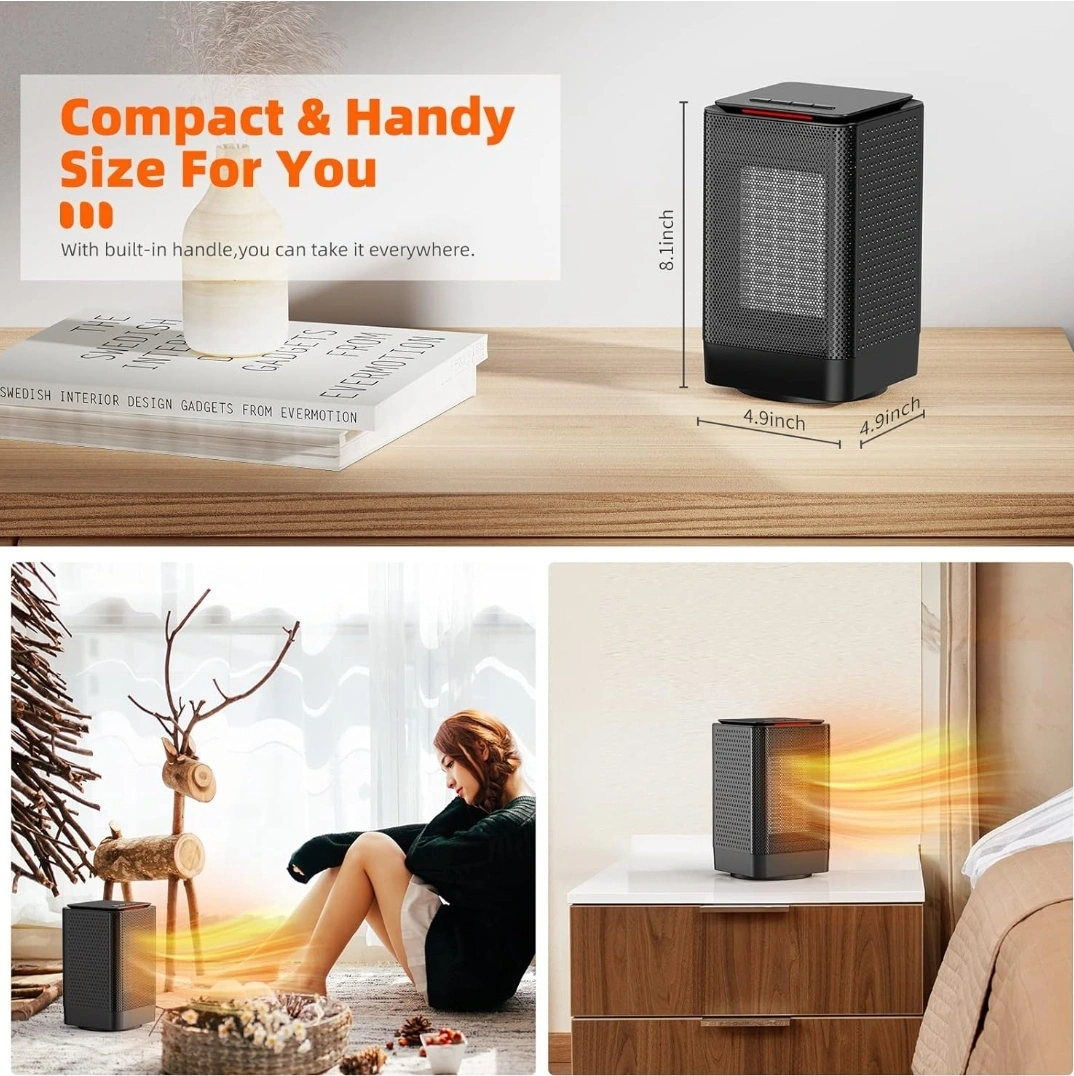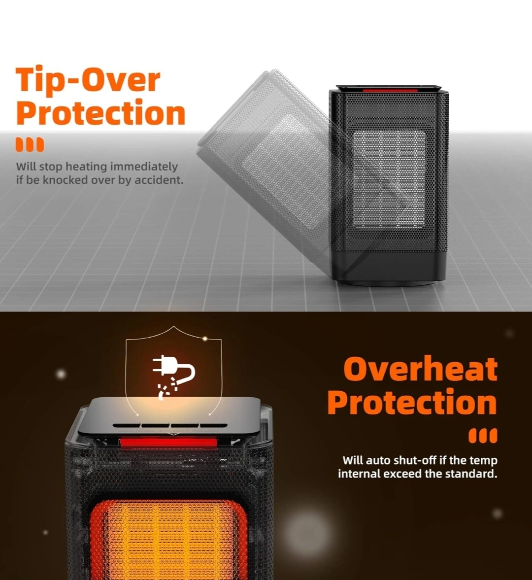 60Portable electric heater. Features three settings: off, fan, low/high heat. Black with mesh front. Good for small spaces.
