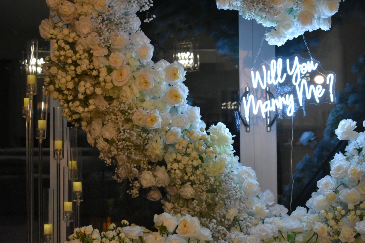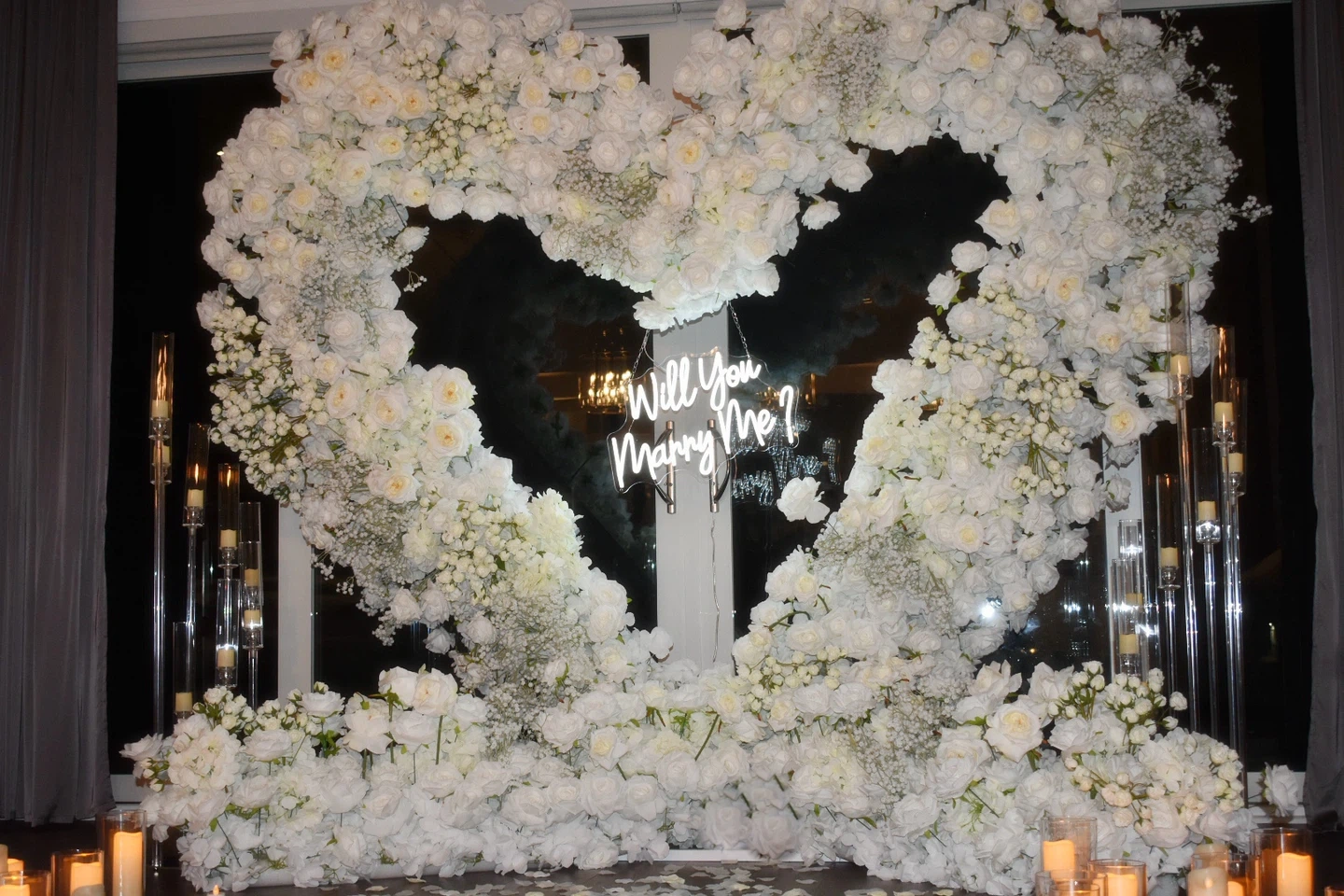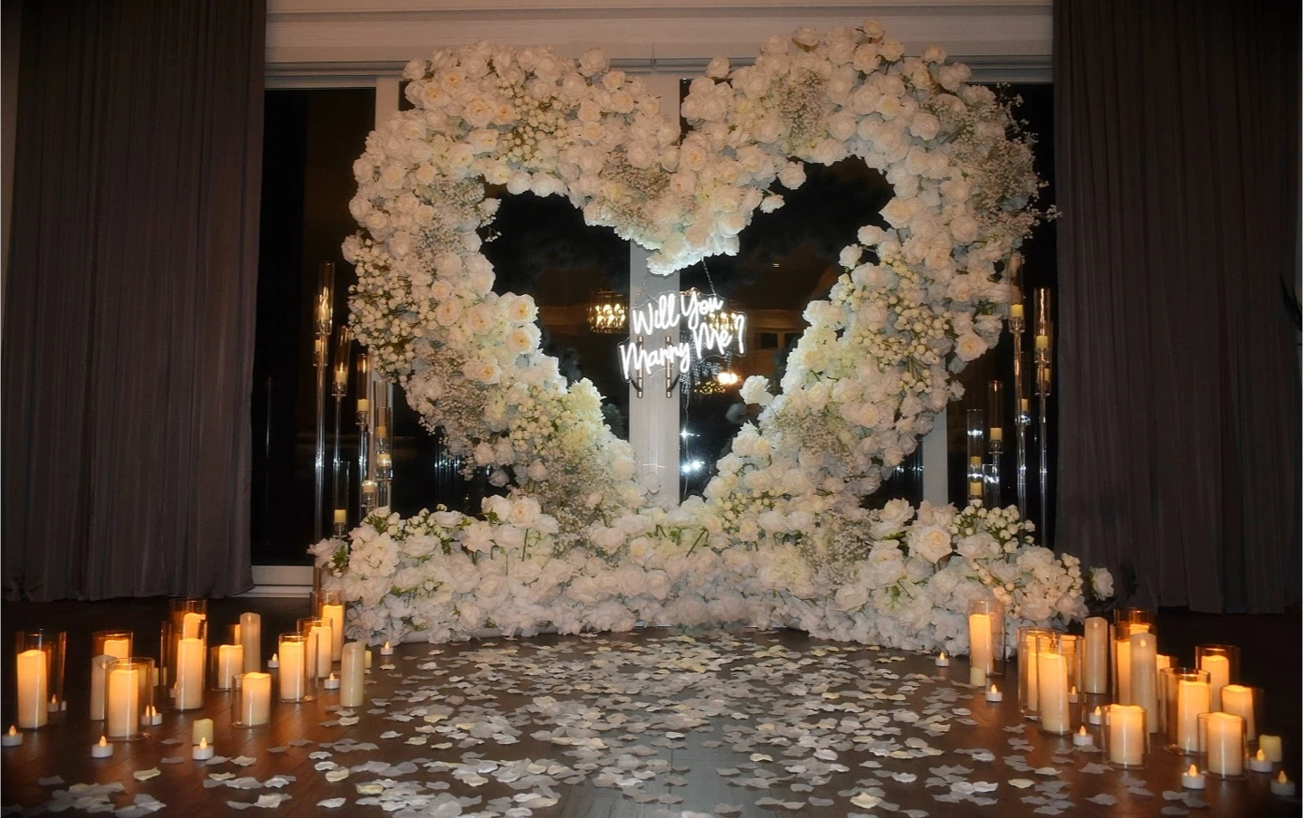 163I’m selling this ENTIRE proposal setup. Complete package. It includes: - White Heart Arch - Cream Rose Petals - Acrylic Candle Holders - Flameless Candles - Neon “WYMM” Sign - Acrylic Candelabras Everything you will need for the perfect proposal setup. Perfect for a rental business or personal use. This setup is brand new and never been used. In perfect condition.