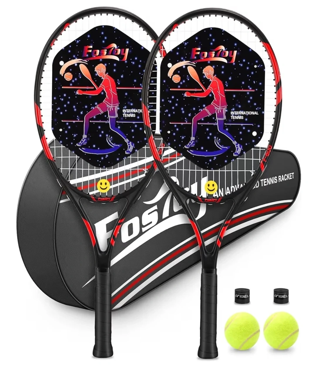 168Step onto the court with confidence and flair with the Fostoy Tennis Racket Set, your all-in-one companion for thrilling rallies and smooth serves. Whether you're a beginner finding your rhythm or a seasoned player refining your game, this set delivers performance, comfort, and style in every swing. What's Inside: - πΈ 2 Premium Tennis Rackets β Crafted with a sleek black-and-red frame and a dynamic string-bed design featuring a stylized tennis player in motion. Lightweight yet durable, perfect for fast-paced play. - π 1 Carrying Case β Branded with "Fostoy" and designed for easy transport and protection. Take your gear anywhere with ease. - πΎ 2 High-Visibility Tennis Balls β Bright yellow for optimal tracking and bounce, ready for practice or match play. - β 2 Overgrip Tapes β Add comfort and personality to your grip. Say goodbye to slippage and hello to smiles! Why You'll Love It: - β Balanced Control & Power β Ideal head size and string tension for precision shots and powerful returns. - β Comfortable Feel β Ergonomic handle and shock-absorbing design reduce fatigue and enhance playability. - β Stylish & Functional β Eye-catching graphics meet practical performance, making this set a standout on any court. Whether you're training, competing, or just having fun, the Fostoy Tennis Racket Set brings joy, energy, and excellence to every match. Unzip the case, grab your gear, and let the game begin!