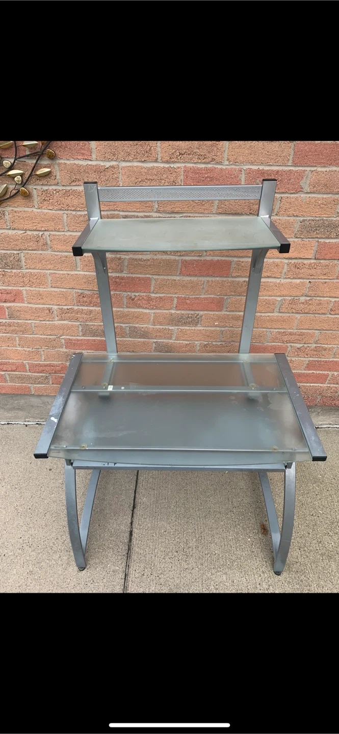 348Computer Desk with Sliding Keyboard and Cushion Chair Set Beautiful Office Computer Desk with sliding keyboard under the desk for the keyboard and mouse. Has a top layer for storage to hold and store books, miscellaneous, games, movies, papers, printer, flowers, etc. Comes with a soft comfortable cushioned office chair, can adjust recline and height on it. Cushioned and soft. Comes with both together to make a perfect computer space or office space for you * Modern computer desk - the tempered glass top along with metal legs makes the computer desk a modern appearance. Matching well with other furniture, this desk is a beautiful décor for your home. * Premium tempered glass-high strength, safe, and elegant, this writing desk brightens your room. * Perfect for any room -clear glass & stainless steel metallic lustre, this study desk makes your room feel larger and brighter. * High-quality hardware shows the extraordinary temperament of the whole desk. * Perfect for using as a work desk for writing with pen/pencil, do homework, projects, writing as a desk or slide the keyboard out and use with a computer and keyboard, laptop The keyboard table is retractable and slides inside and out. It can be used as a table and writing desk when inside, and can be used with computer and keyboard when slide retracted out. Has a table ontop for extra storage, keep printer, papers, books, binders, works, pens/pencils or decorations ontop. Can be picked up or delivered Cheap - message me