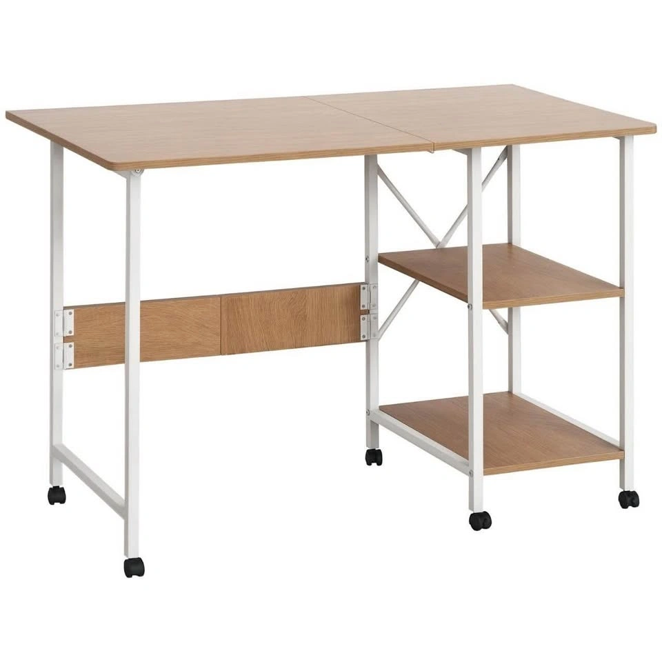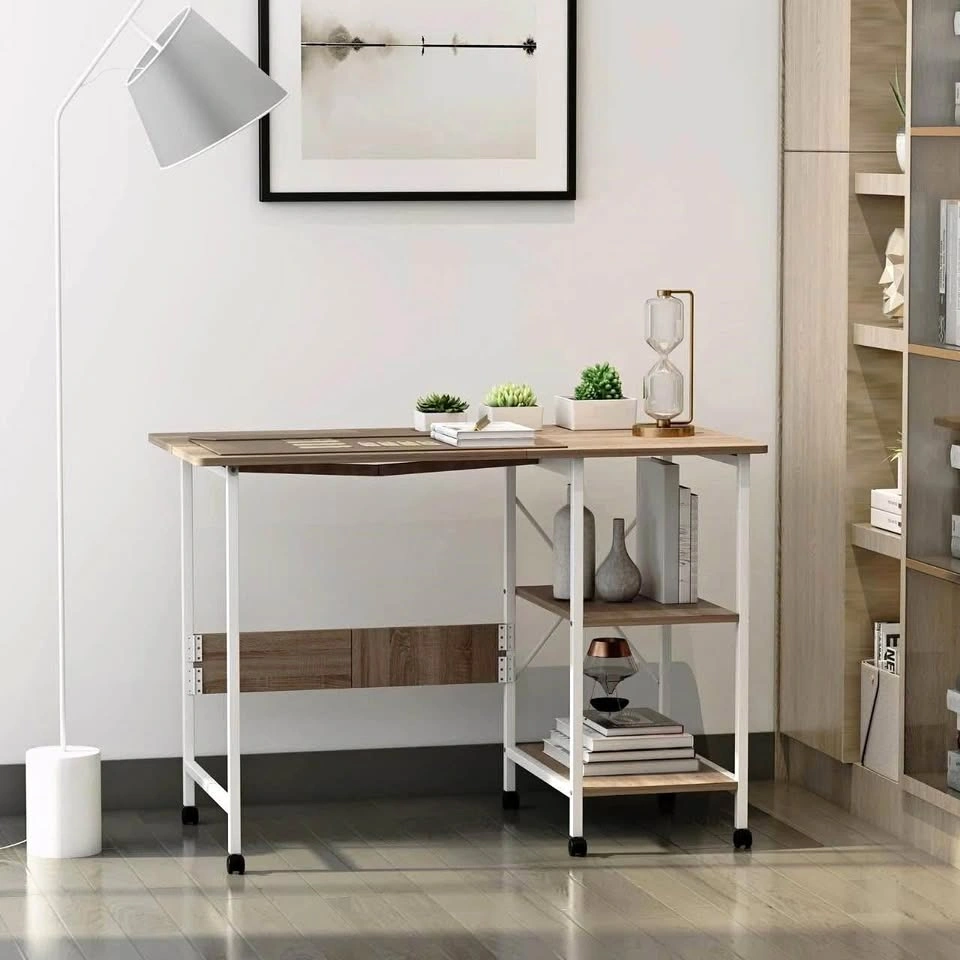 60Open Box – Good Condition Space-saving folding desk with metal frame and particleboard top. Left side folds down and right side works as a shelf. Includes wheels for easy movement. Size: 42.1" W x 21.7" D x 29.9" H (folds to 19.1" W) Weight: 30 lbs | Capacity: 20 lbs