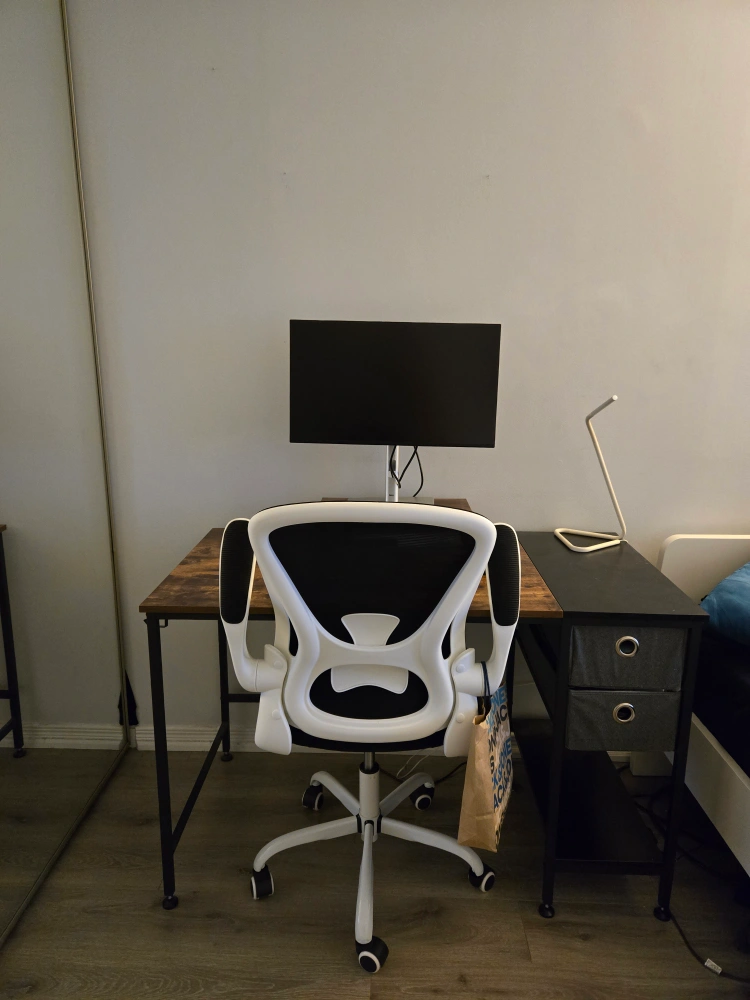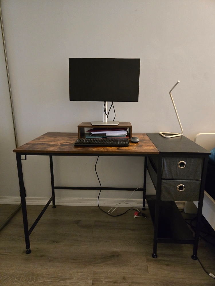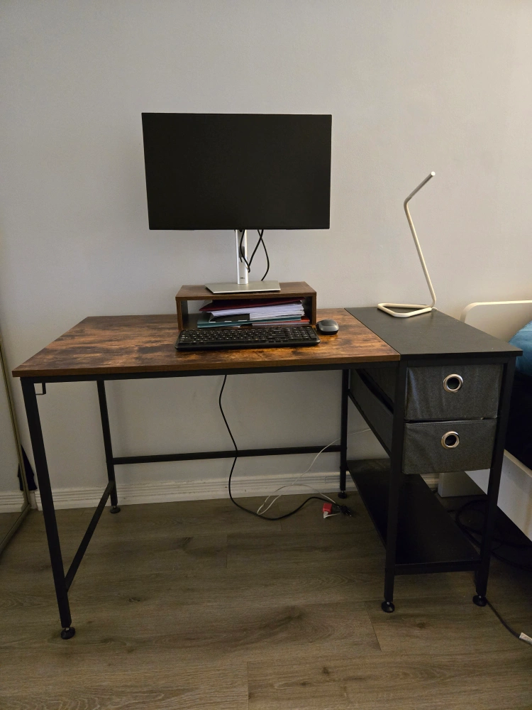 Looking to sell this computer desk with a drawer unit. The desk has a wood-look top and black metal legs. The drawer unit features two drawers with fabric fronts and metal pulls.It's in great shape and ready for a new home. https://a.co/d/2EE7HoG