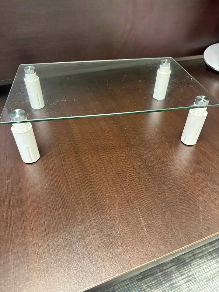 2615” L x 9.5” D x 4” H glass, computer, riser, white legs