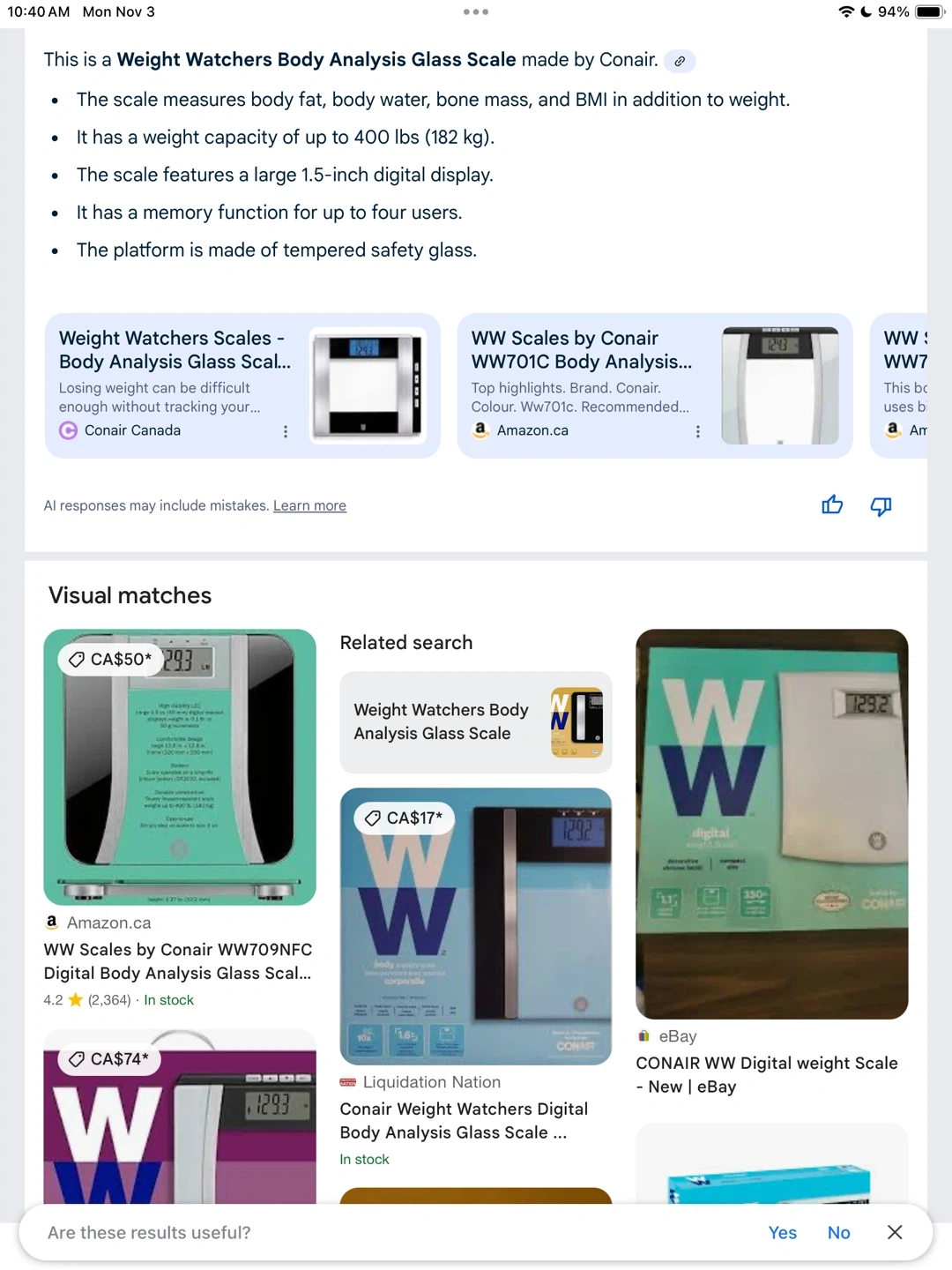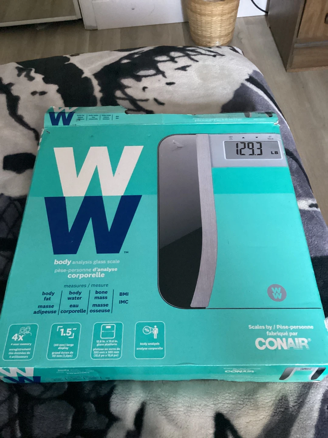 20I'm selling a brand new Conair body analysis glass scale, still in its original packaging! It measures body fat, body water, bone mass, and BMI, giving you a comprehensive overview of your health. The scale has a large 1.5" display and measures in both pounds and kilograms. Box is a little crushed from storage Pick up Centretown or can meet locally to suit