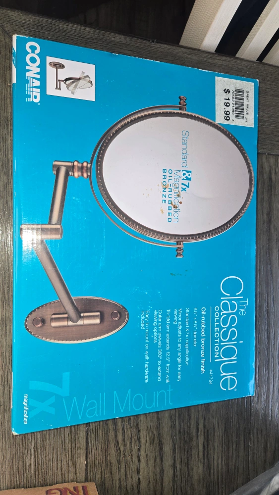 Selling a Conair Classique wall mount mirror in oil-rubbed bronze finish! It features 7x magnification, perfect for detailed makeup application or grooming. The mirror adjusts to any angle for easy viewing. The tri-fold arm extends 12.5" from the wall and the outer arm swivels 360° to extend viewing options. Easy to mount on the wall, with hardware included. Originally bought for $19.99