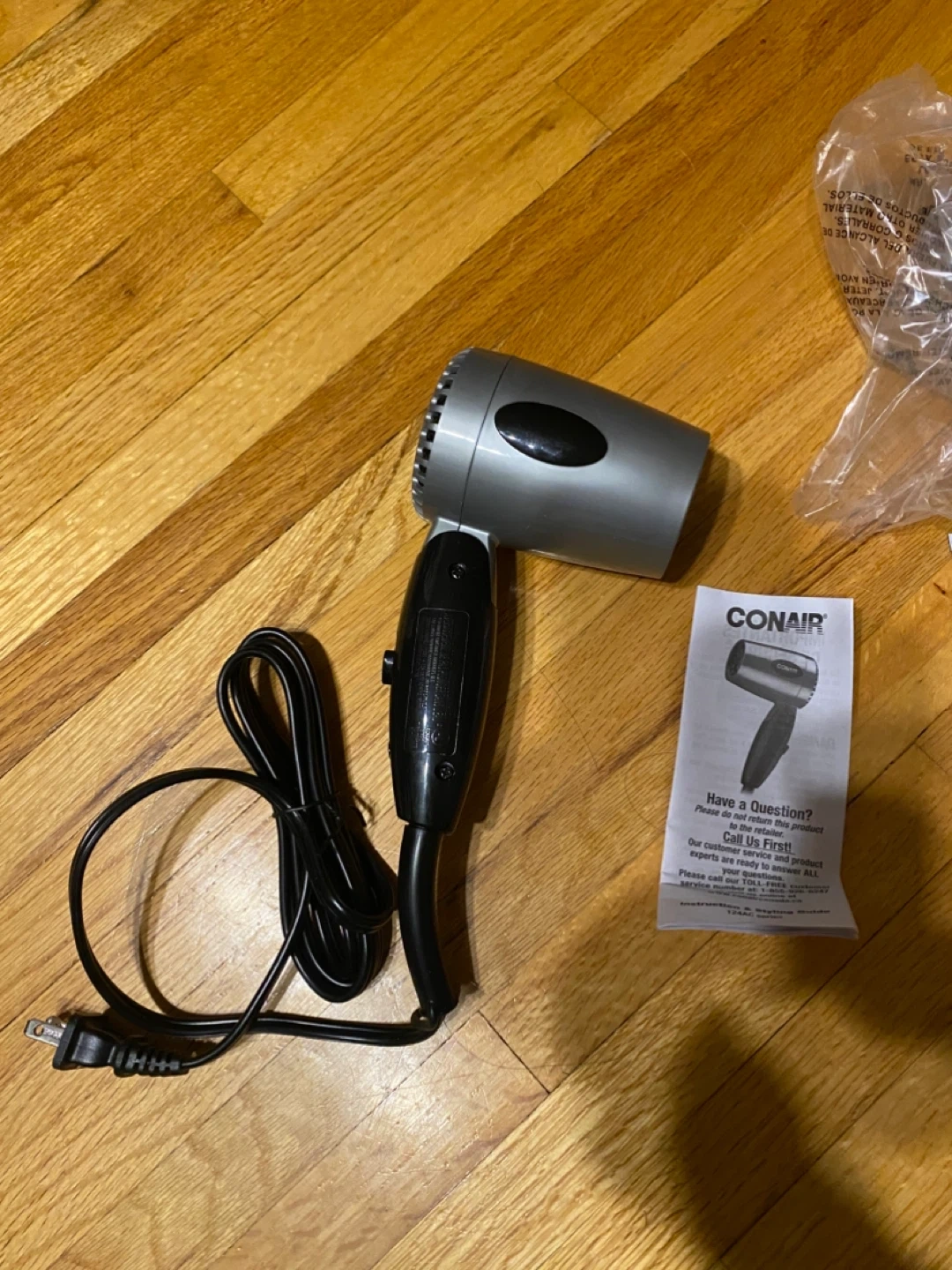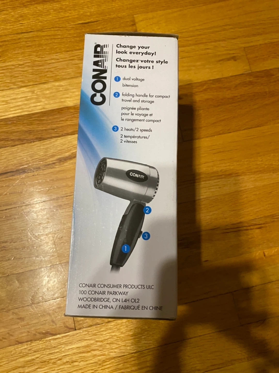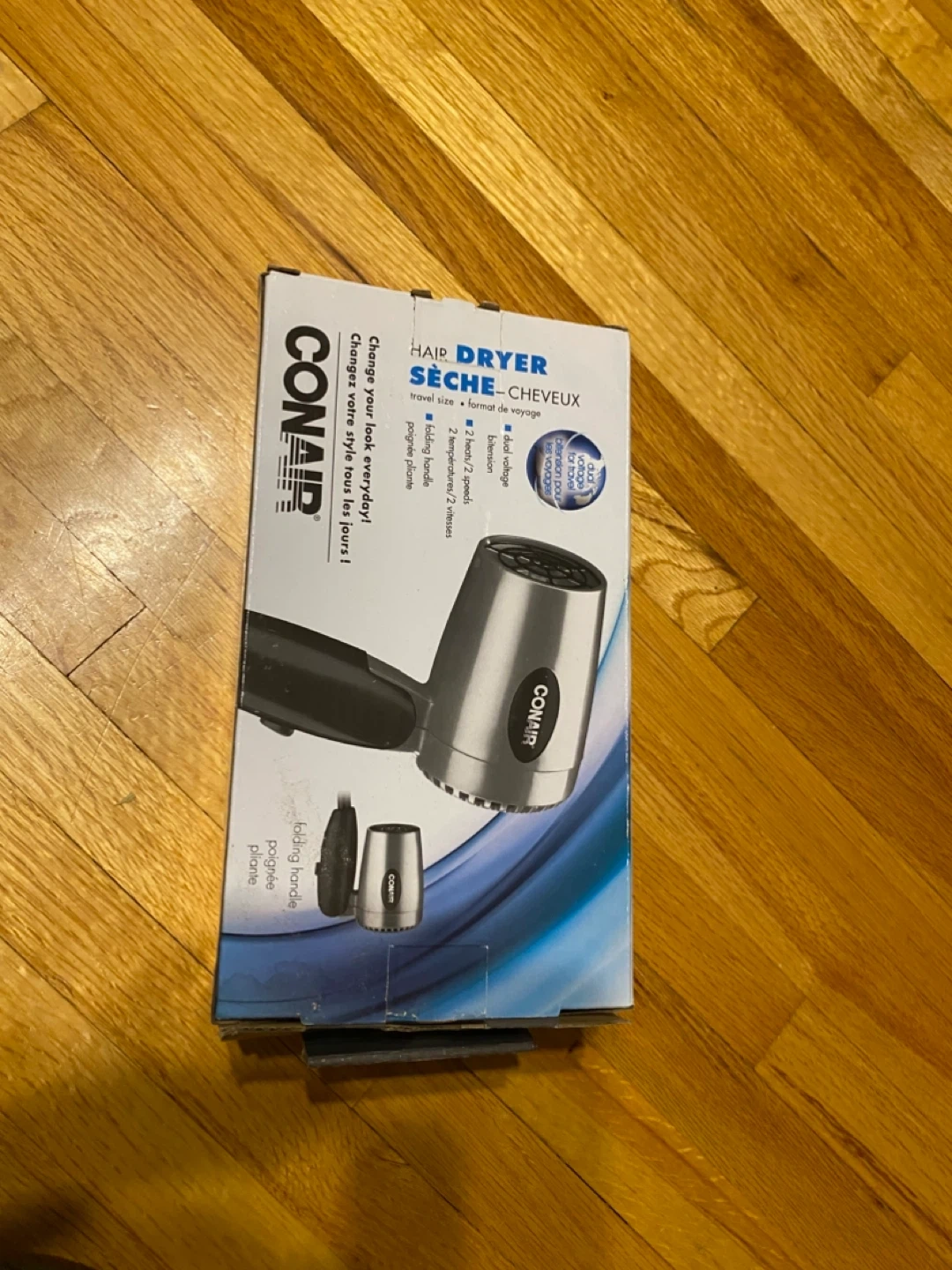 65Compact Conair hair dryer in great condition! It features dual voltage, making it perfect for travel. The folding handle adds to its portability and storage convenience. It has 2 heat/2 speed settings and comes with the original box