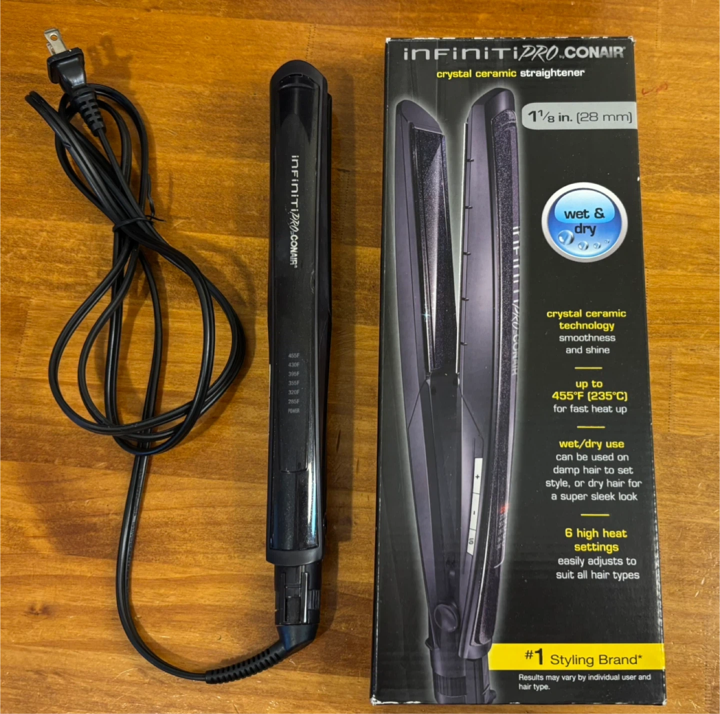 194Selling an Infiniti Pro Conair crystal ceramic hair straightener! It heats up fast to 455°F (235°C) and has 6 heat settings to suit all hair types. It can be used on wet or dry hair for a super sleek look. Comes with the original box