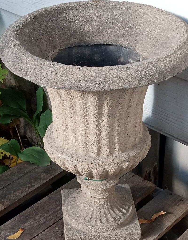 111Selling a concrete garden urn. It's a nice piece to add to your garden or patio. It has some signs of wear and tear, but it's still in good condition and ready to be used for planting flowers or other plants