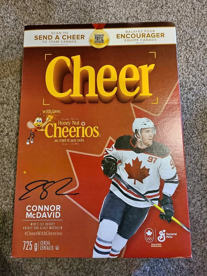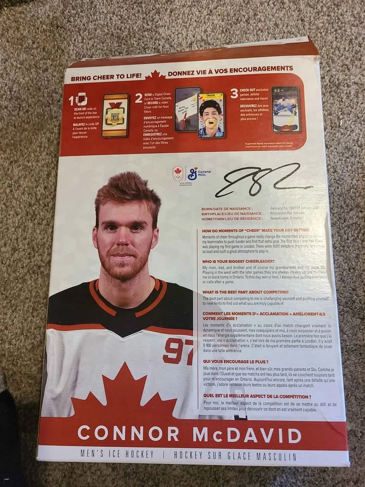10Rare Connor Mcdavid Team Canada empty Cheerios box... As seen in the pics and video, box is in excellent condition Pick up Guelph Line and Upper Middle area