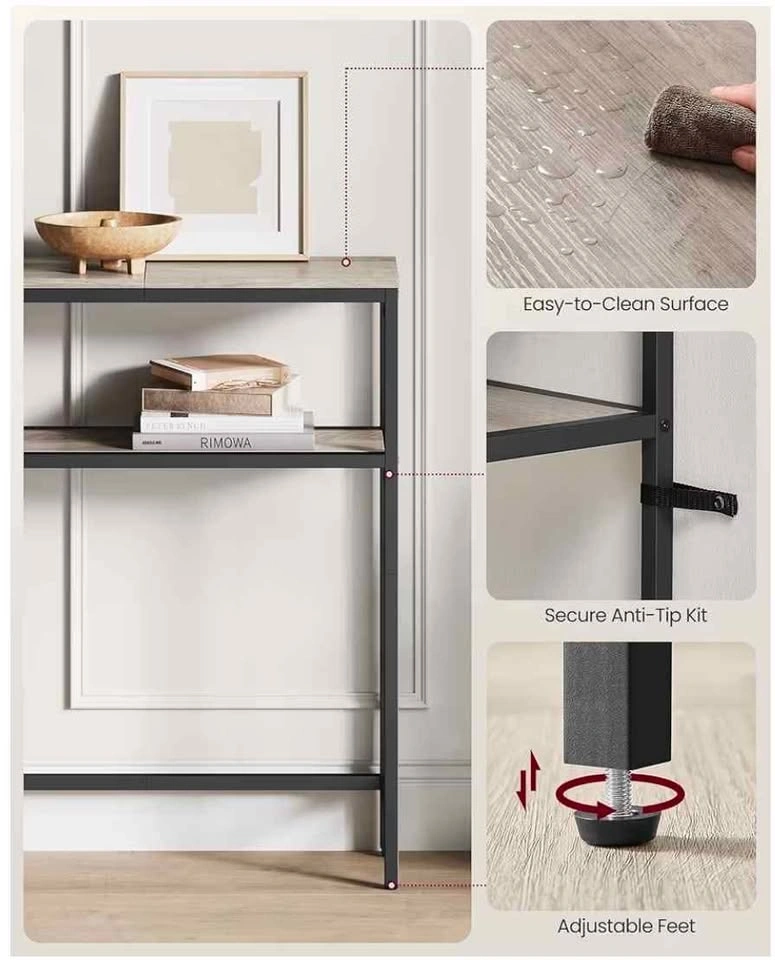 49Modern 2-tier console table in Heather Greige & Ink Black finish. Slim design — perfect for entryways, hallways, or behind sofas. Durable metal frame, adjustable feet, and easy-to-clean surface. Brand new, pulled from a liquidation pallet.