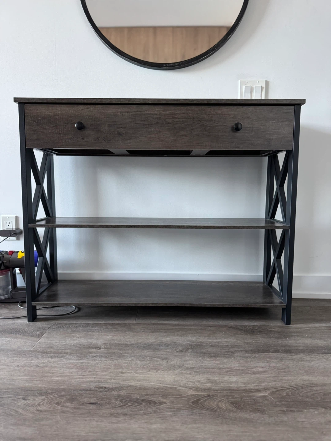 Selling a console table, perfect for an entryway or living room! It features a drawer for storage and two shelves for displaying items. The dark wood finish and black metal frame give it a modern look. It's in great condition and ready for a new home!