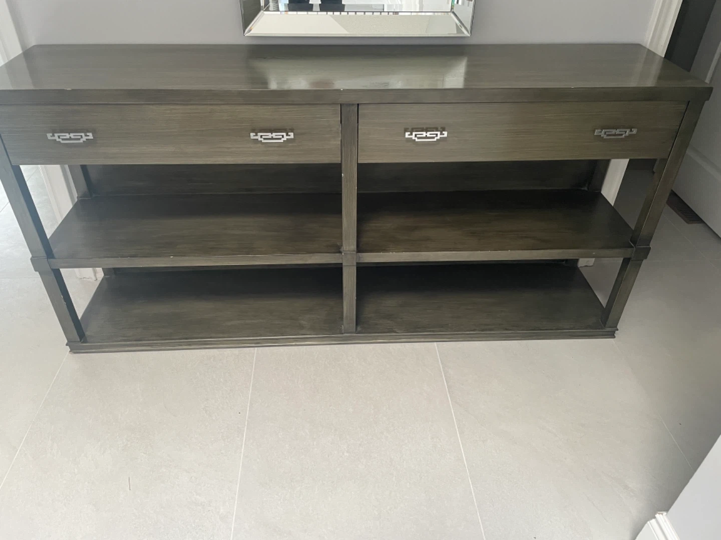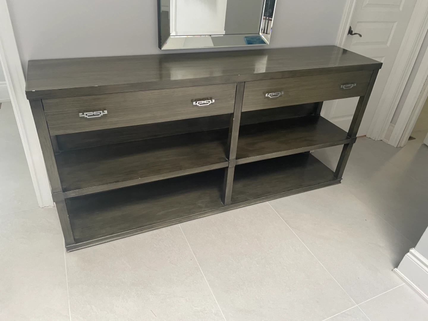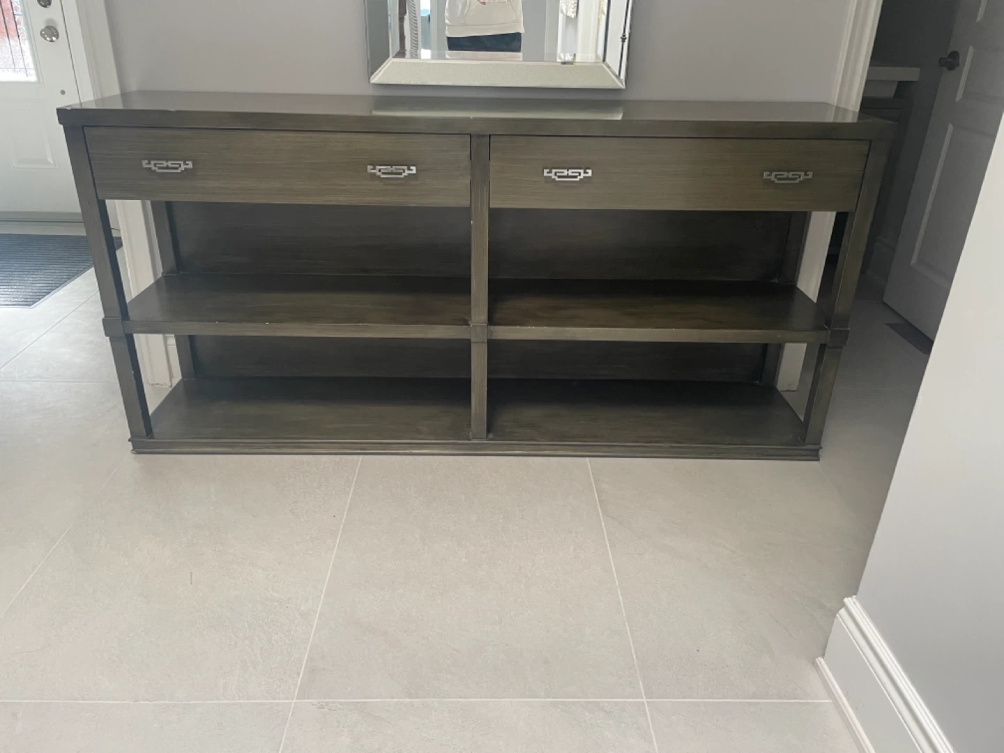 Selling a console table with drawers. It features two drawers and two open shelves, providing ample storage and display space. The table has a neutral colour that would fit in with any decor. It's in great condition and ready for a new home
