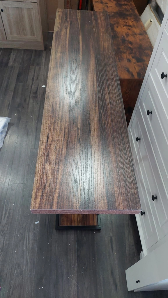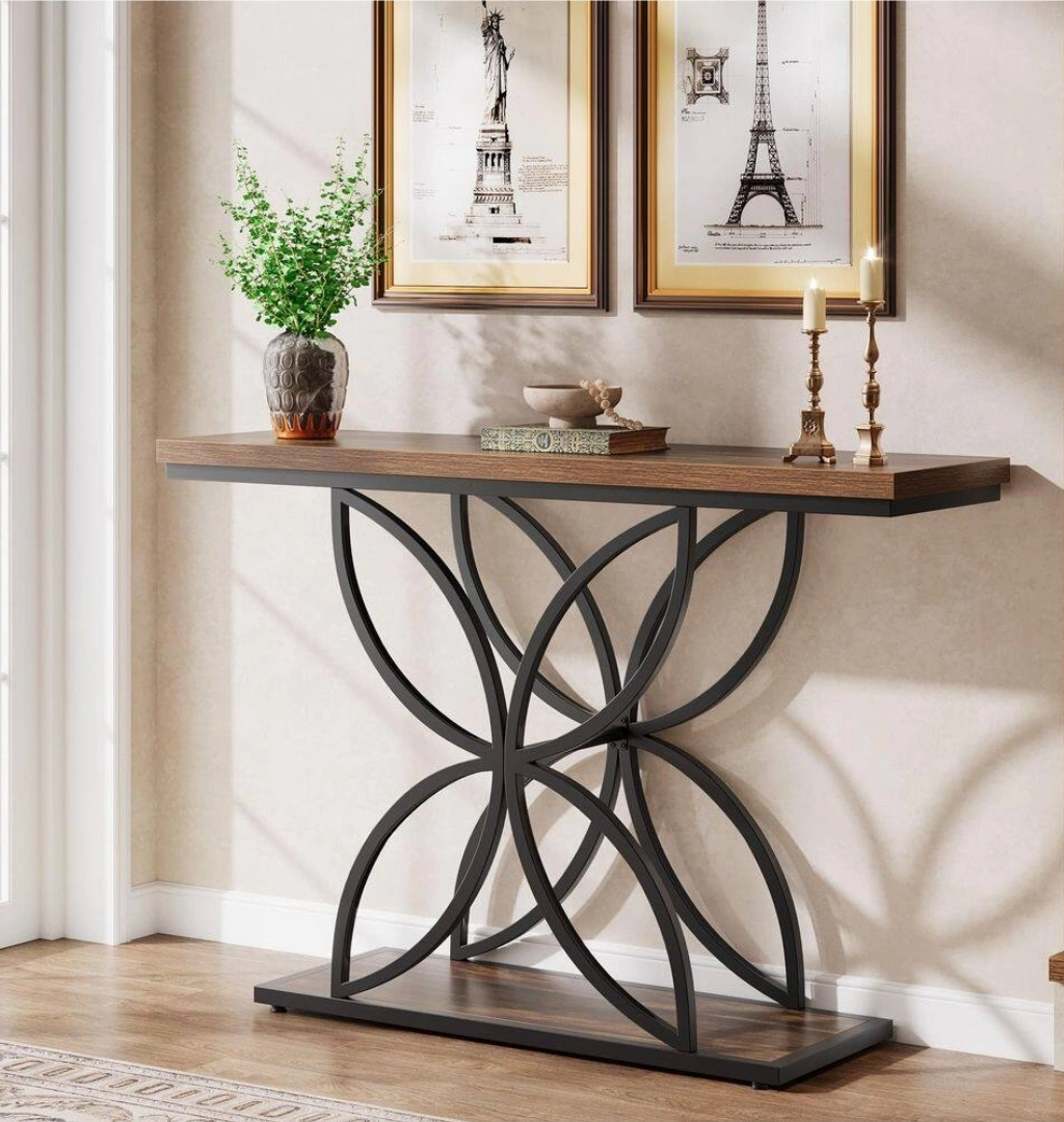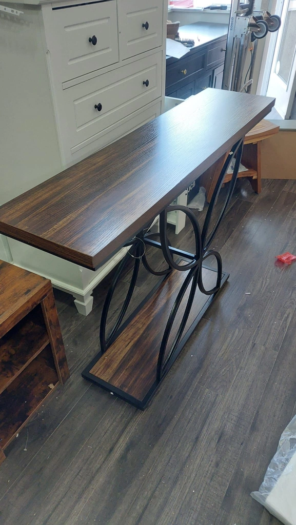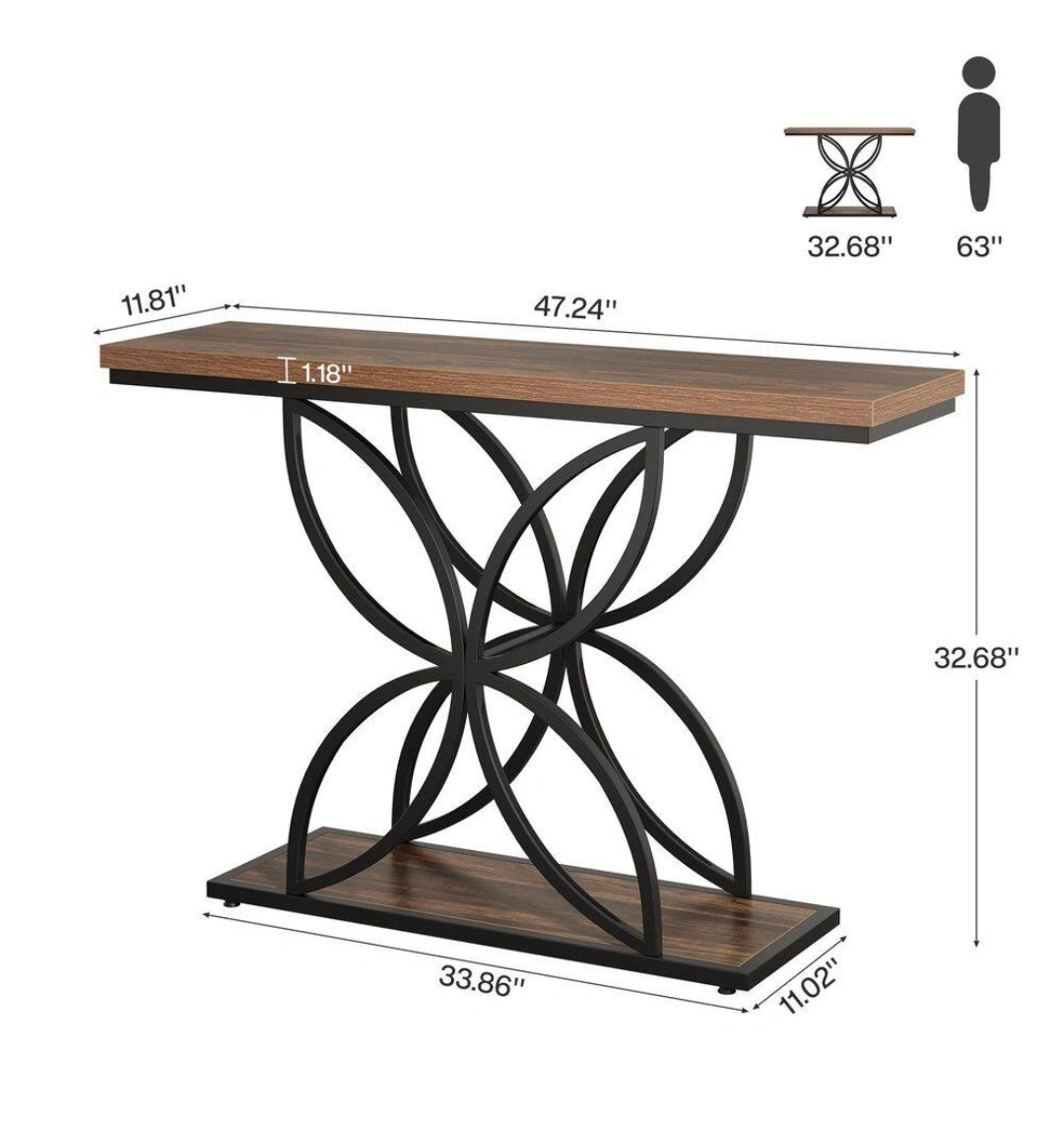 This console table features a dark wood-tone top and base with a unique black metal geometric design. It's a stylish addition to any entryway or living room. The table is 47.24 inches long, 32.68 inches high, and 11.81 inches wide. The base is 33.86 inches long and 11.02 inches wide. Brand New