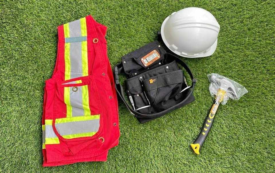 High quality vest, pouch, hammer and a hard hat all in nearly brand new condition.