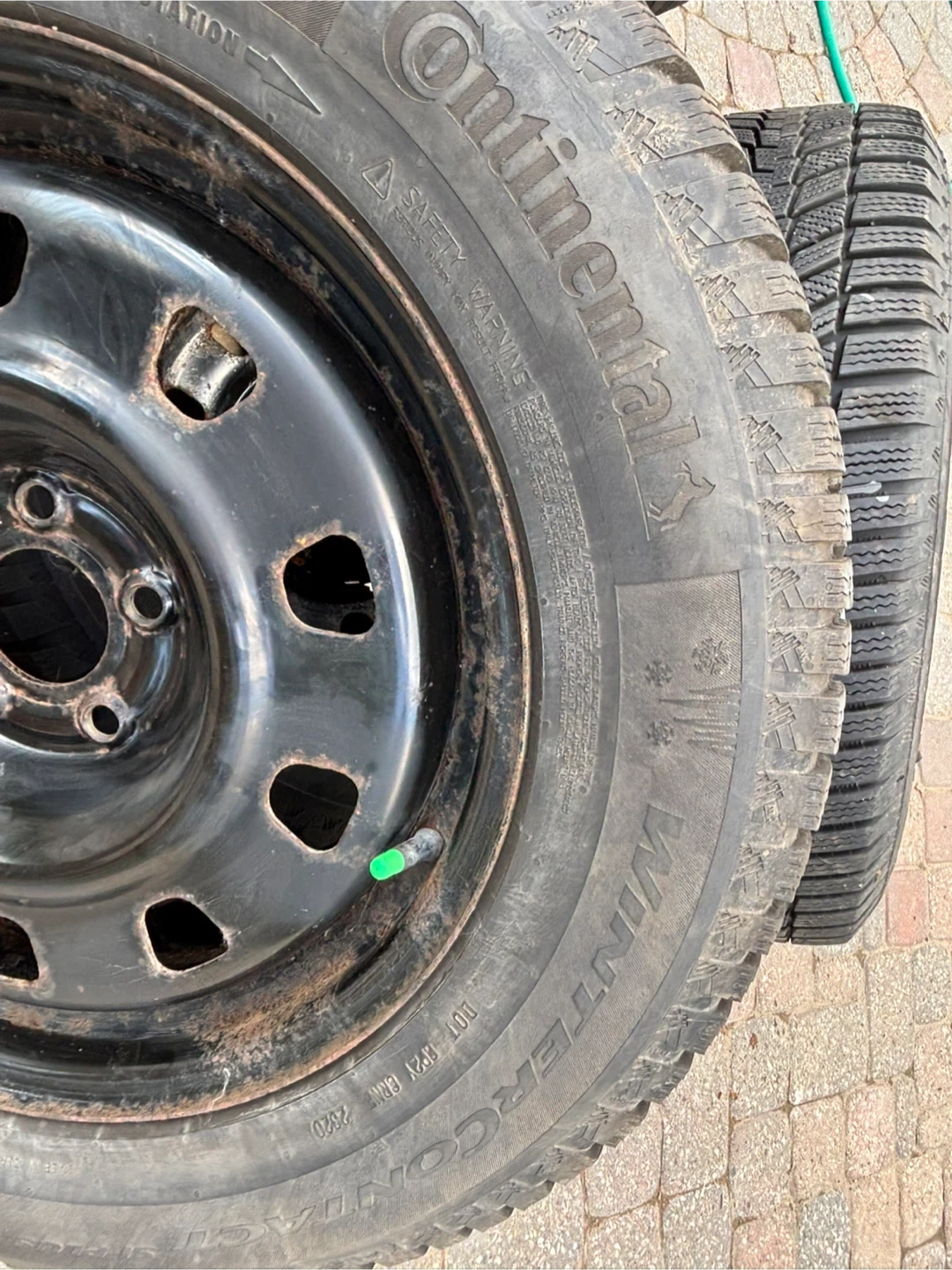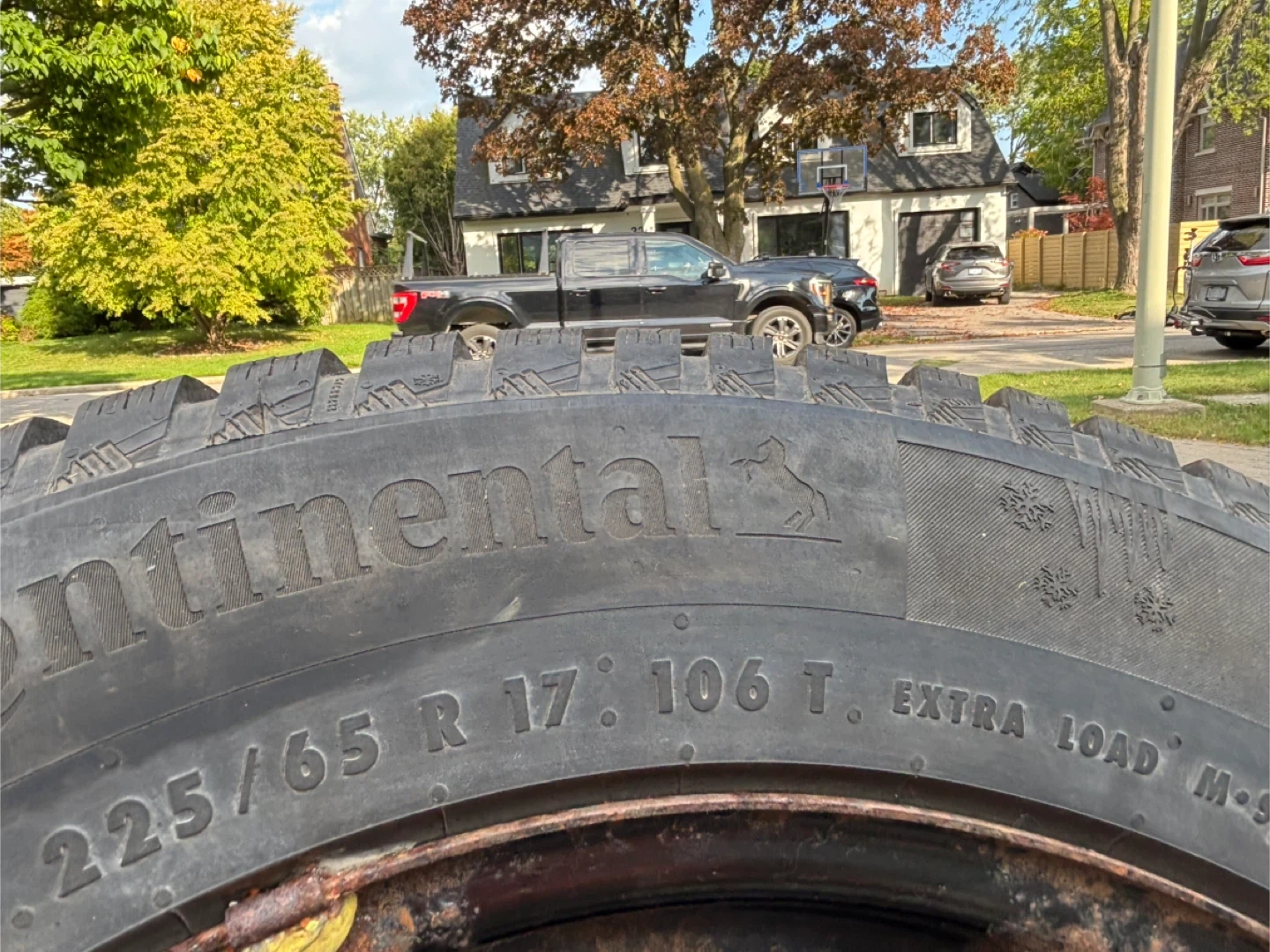 60Selling a set of four Continental WinterContact tires mounted on rims, complete with hubcaps. The tire size is 225/65R17. They are marked 106T and EXTRA LOAD.