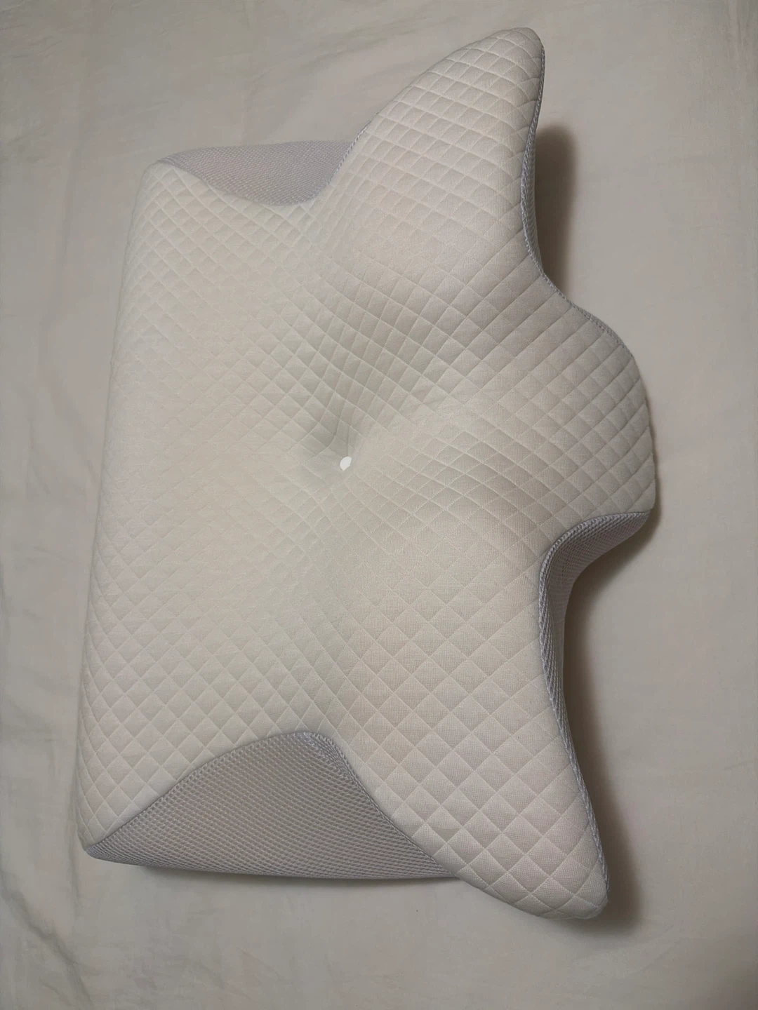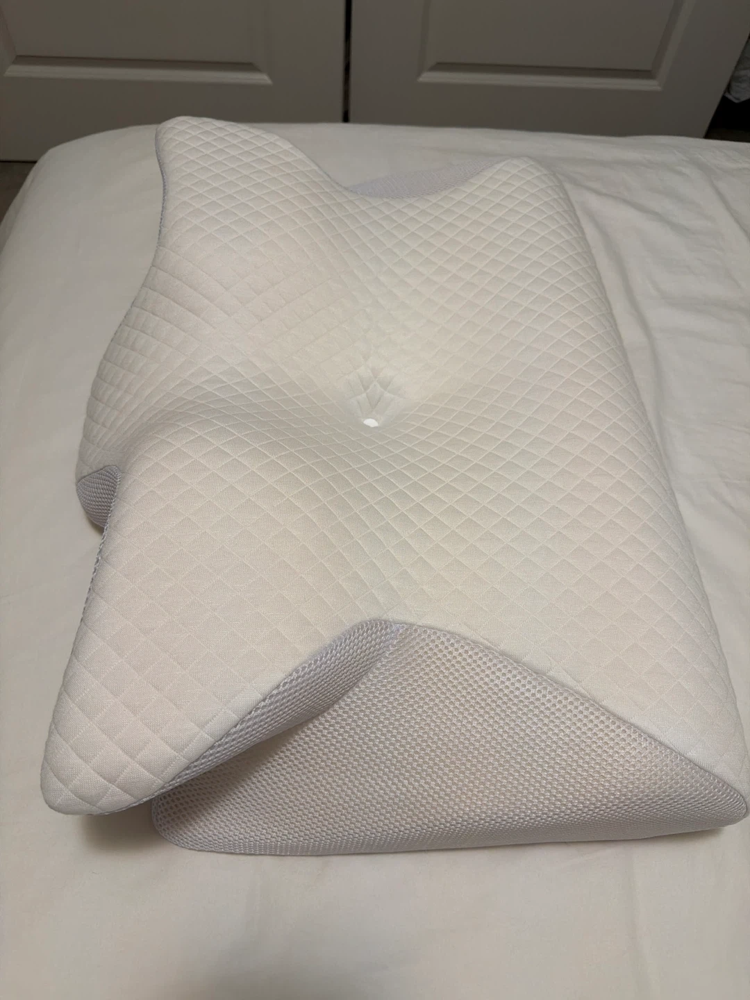 60This is a contour memory foam pillow! It's designed to provide neck support and promote proper spinal alignment while you sleep. The unique shape is meant to reduce pressure points and ensure a comfortable night's rest.