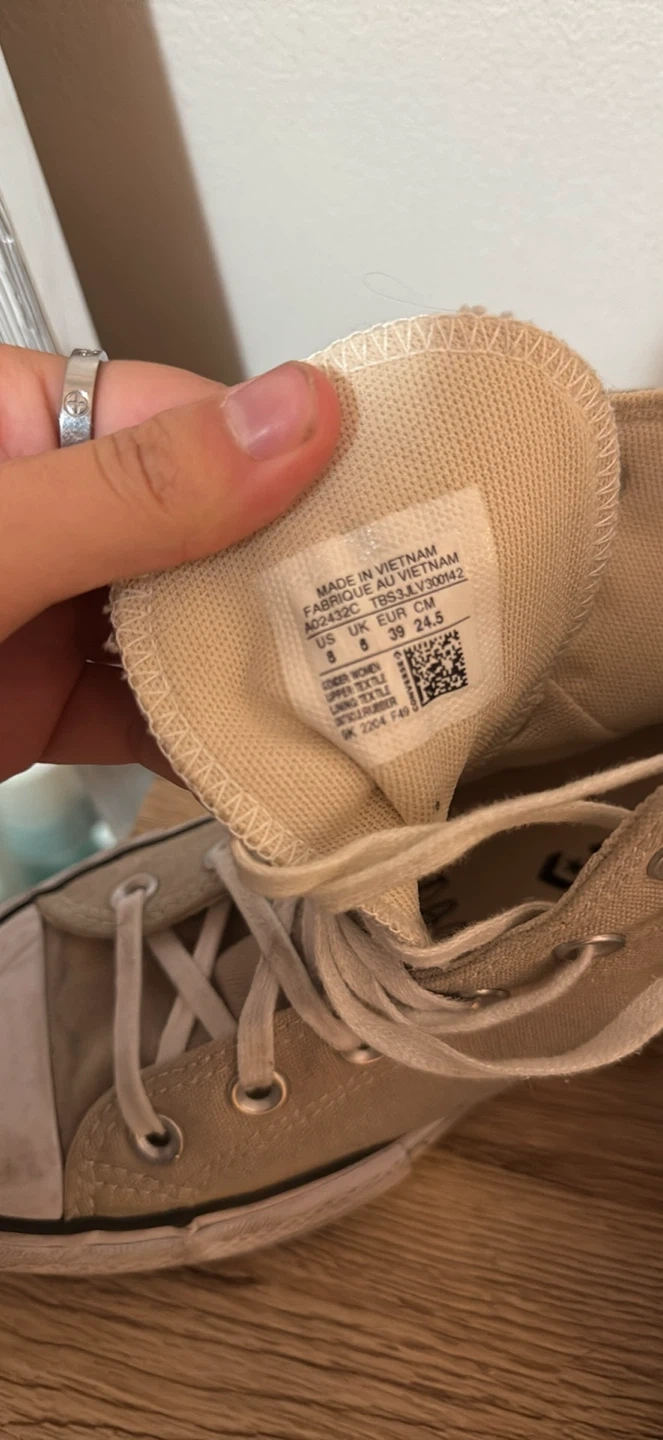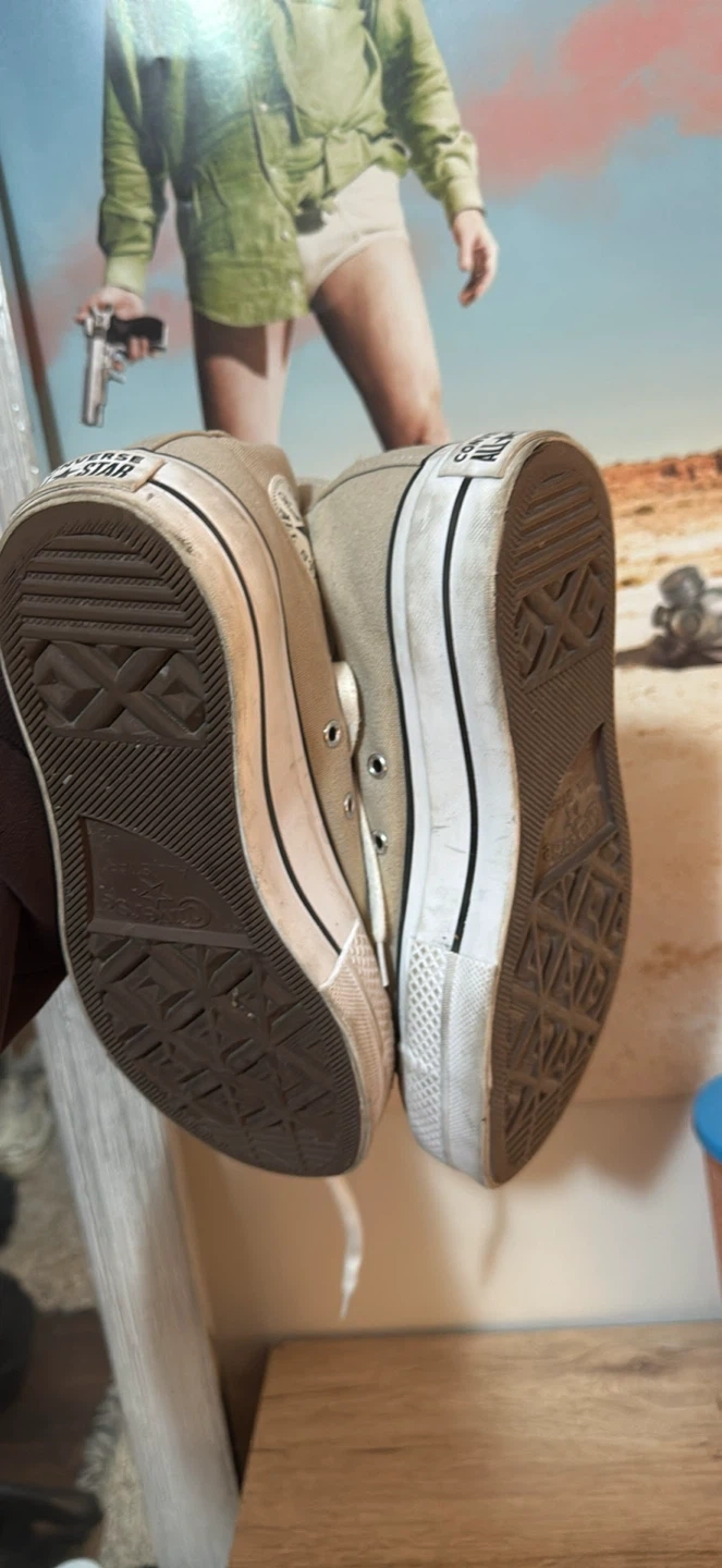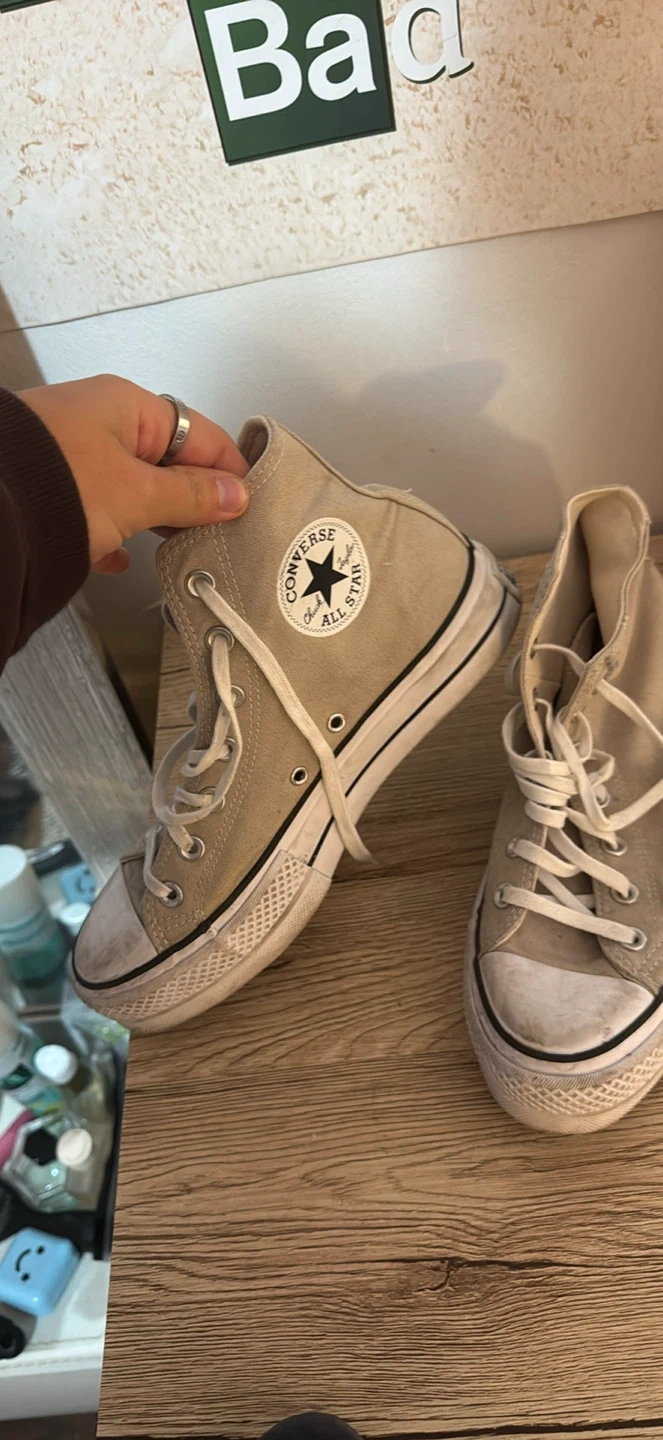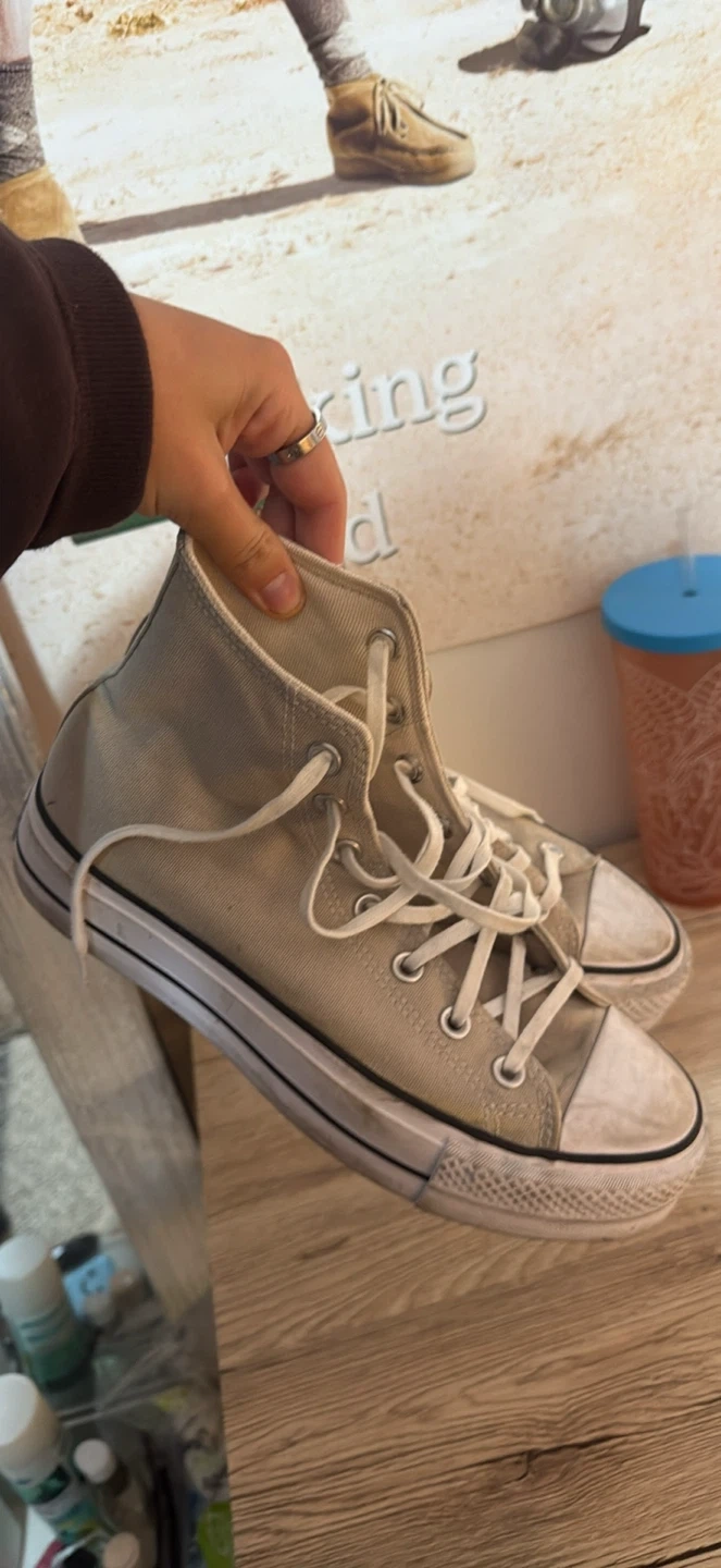 60Selling a pair of Converse All Star high tops! They're a beige colour and in US size 8. They have some wear and tear, but still have lots of life left in them!