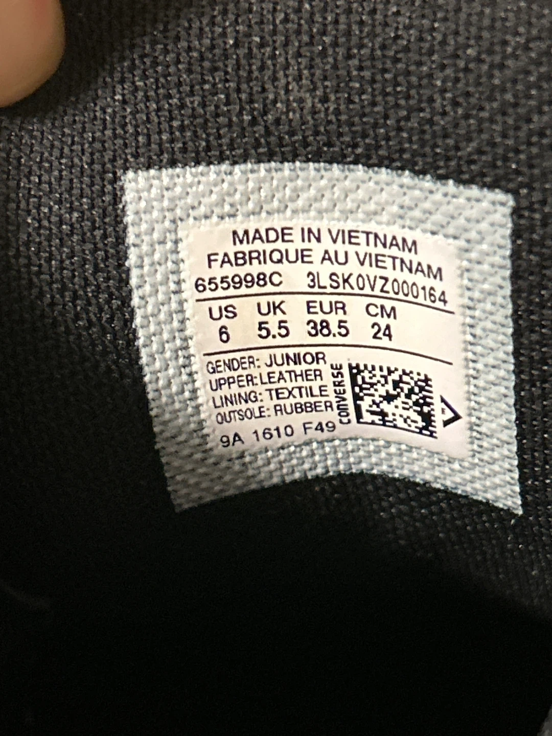 10Selling a pair of new Converse All Star high-top sneakers in grey and white. These are a youth size 6. The upper is leather, and the outsole is rubber.